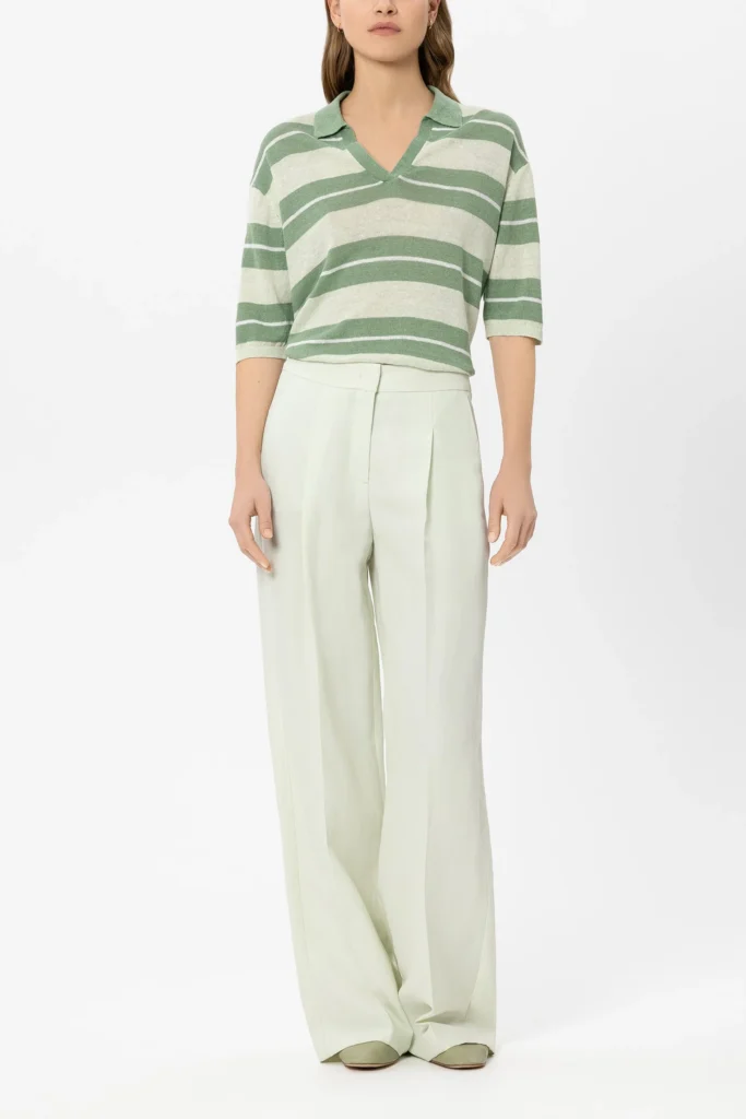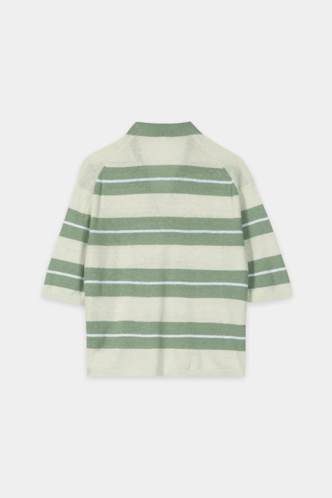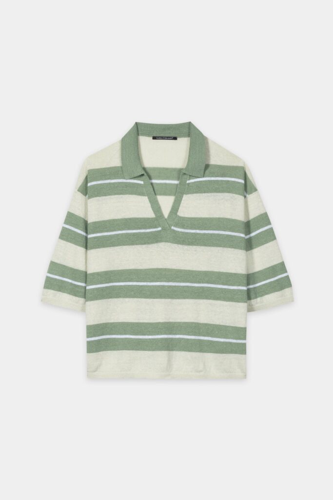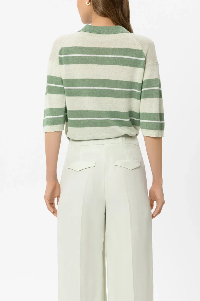 Vācu premium klases apģērbu zīmola Luisa Cerano sieviešu polo stila krekls ar horizontālu svītru rakstu gaiši dūmakaini zaļos toņos. Izgatavots no Itālijā ražotas linu dzijas smalkā adījuma rakstā. Papildināts ar V veida kakla izgriezumu un pusgarām piedurknēm, kā arī rievotu aproču un apakšmalas apdari.