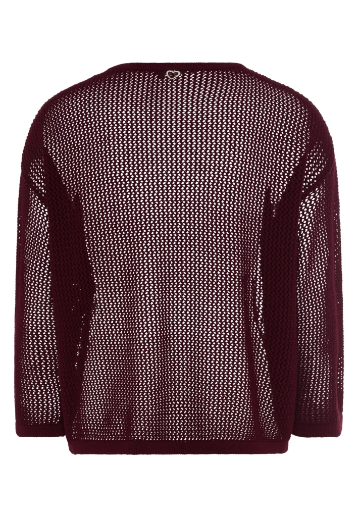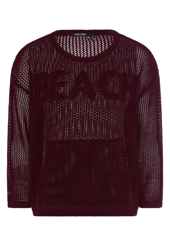 Vācu modes zīmola Marc Aurel sieviešu džemperis ar garām piedurknēm bordo krāsā. Izgatavots no vasarīgas kokvilnas dzijas tīklveida adījuma rakstā. Akcentēts ar ķengurkabatu un dekoratīvu uzrakstu BEACH, kā arī smalku sirdsveida logotipu pie apkakles mugurpusē.