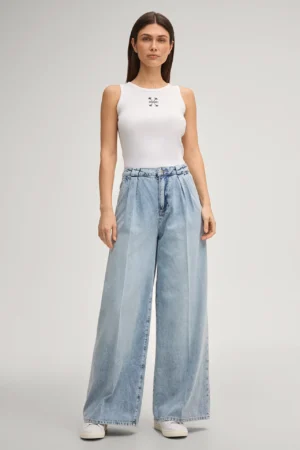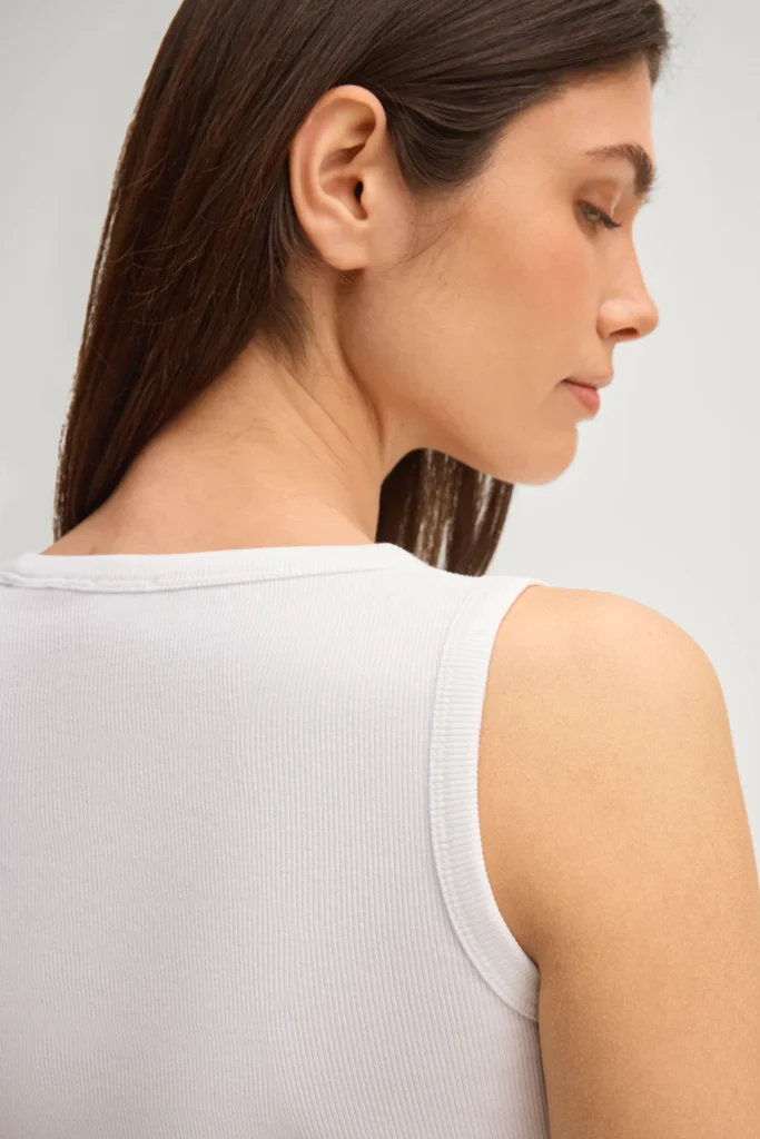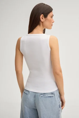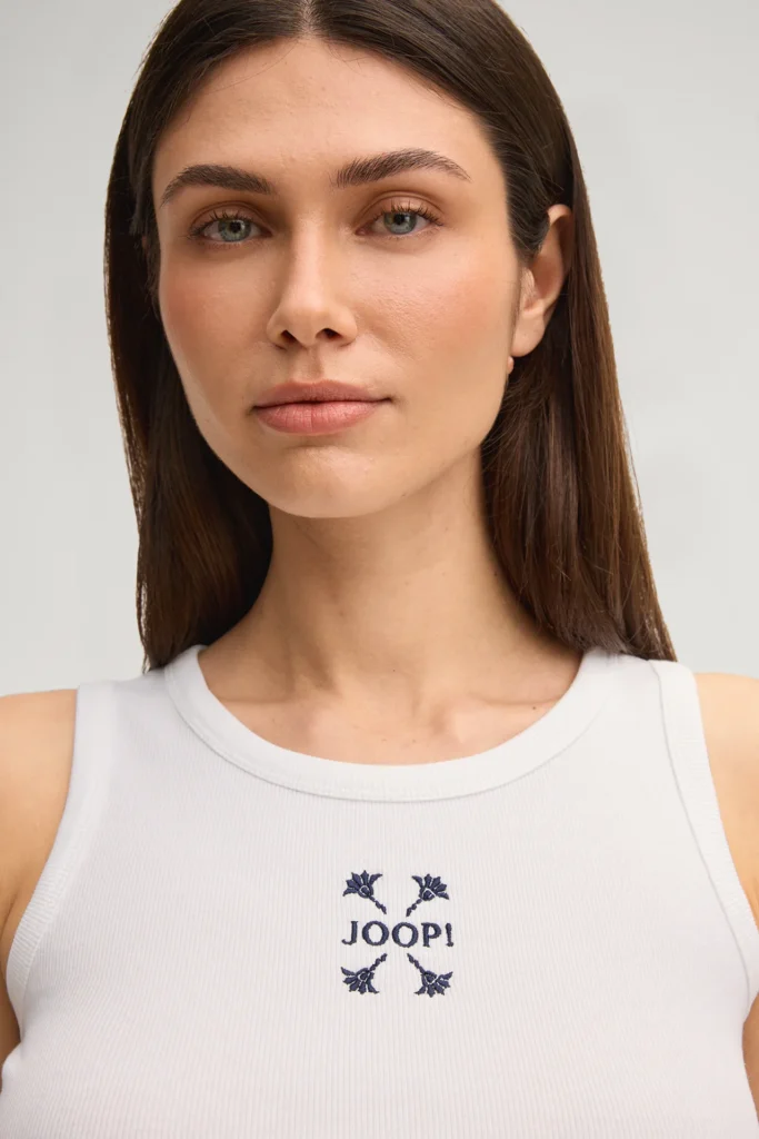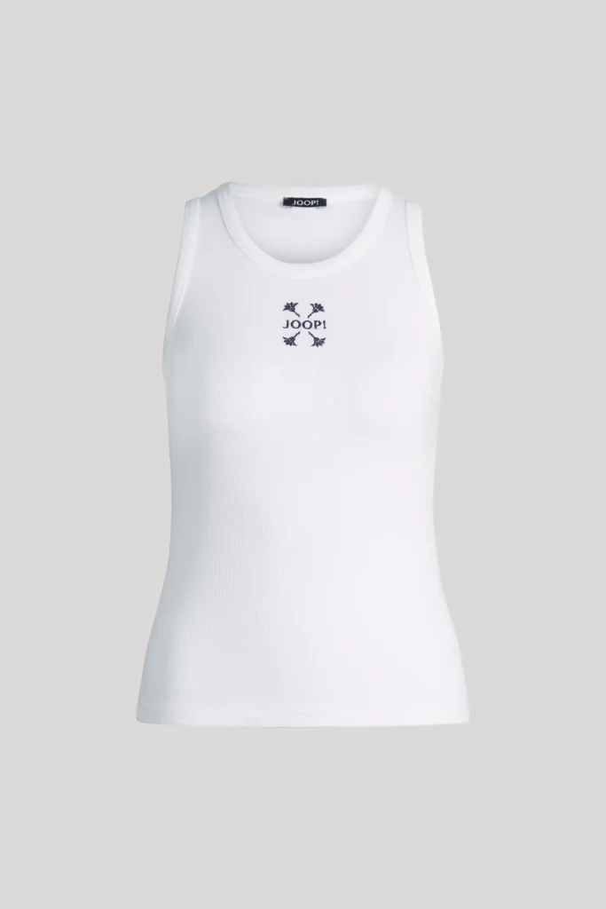 Vācu modes zīmola Joop! smalki rievots sieviešu krekliņš bez piedurknēm baltā krāsā. Izgatavots no elastīga kokvilnas materiāla. Papildināts ar kontrastējošu zīmola logo dizaina izšuvumu priekšpusē.
