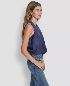 ASV modes zīmola DKNY tumši zils sieviešu tops bez piedurknēm un ar elastīgu burbuļveida apakšmalu. Izgatavots no viegli kopjama satīna struktūras materiāla. Akcentēts ar zīmola logotipa vientoņa izšuvumu priekšpusē un greznu mākslīgo akmentiņu pogu mugurpusē.