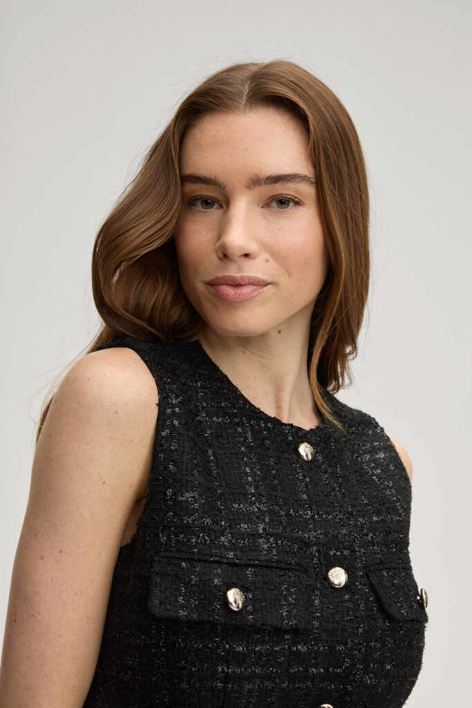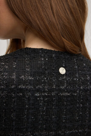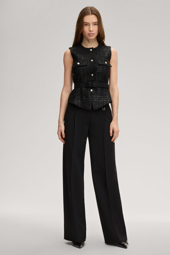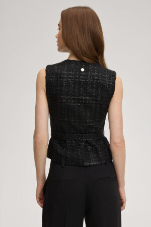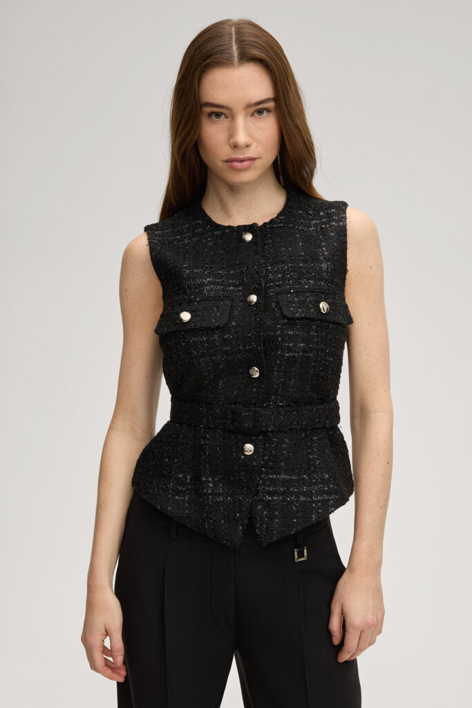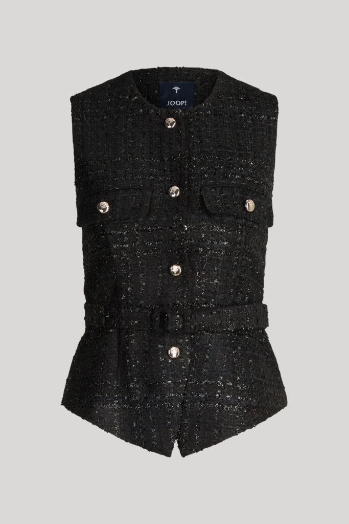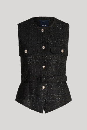 Vācu modes zīmola Joop! melna sieviešu veste ar savelkamu jostu. Izgatavota no teksturēta tvīda auduma ar melni mirdzošu rūtoto rakstu. Papildināta ar dekoratīviem kabatu atlokiem un V veida stūriem apakšmalā. Akcentēta ar zīmola logotipa zelta krāsas pogu aizdari un smalku zīmola emblēmu mugurpusē.