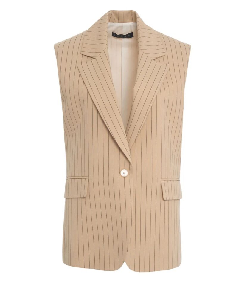 Itāļu modes zīmola KAOS universāla sieviešu žaketes stila veste bēšā krāsā ar smalku vertikālo svītru rakstu. Izgatavota no viegla viskozes maisījuma materiāla. Papildināta ar klasiskiem atlokiem un škēlumiem mugurpusē sānos.