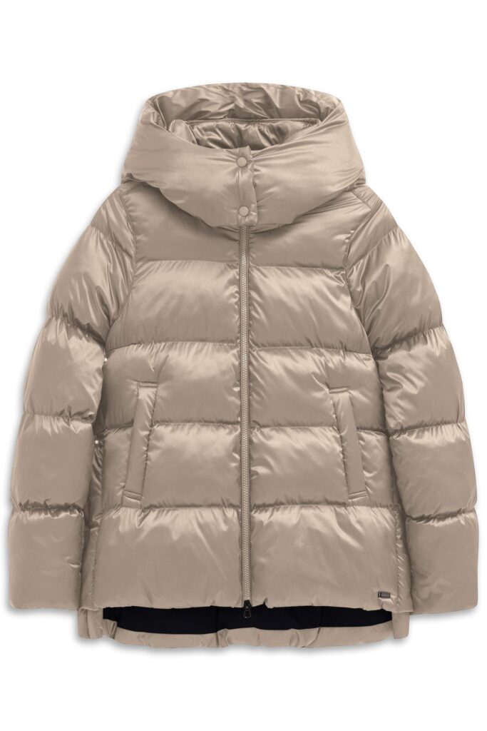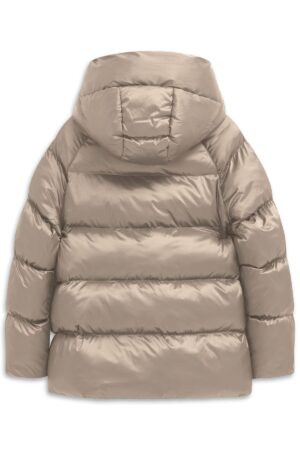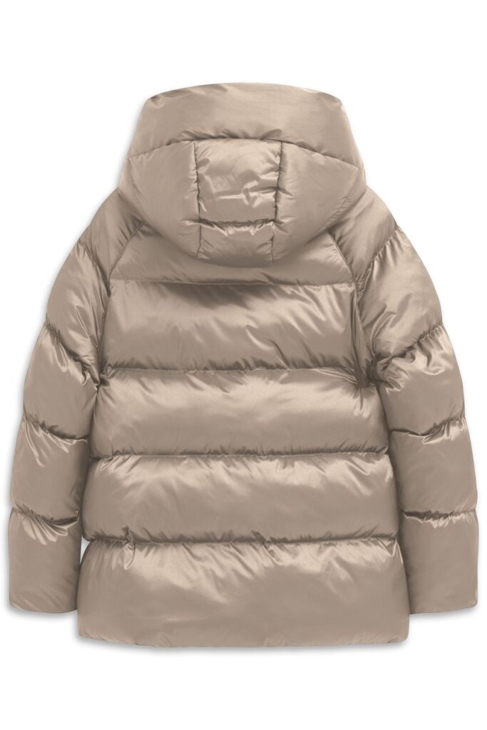 Vācu modes zīmola Bugatti polsterēta sieviešu virsjaka bēšā krāsā. Izgatavota no augstākās kvalitātes poliestera materiāla ar satīna spīdumu. Papildināta ar noņemu kapuci, mugurpusē pagarinātu apakšmalu un sānu šķēlumiem ar spiedpogu aizdari, kā arī zīmola logotipa akcentu apakšmalā.