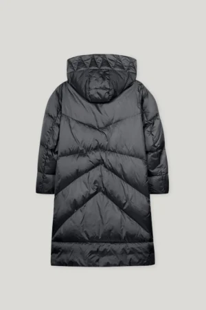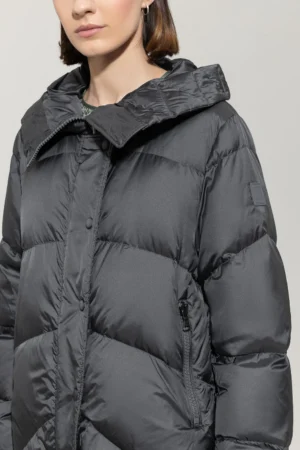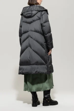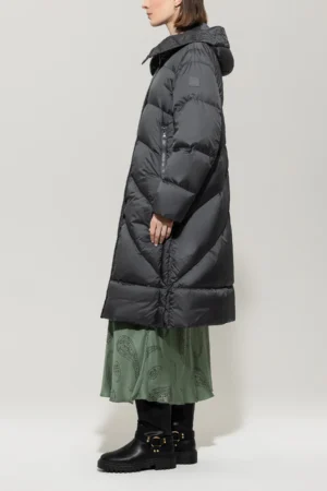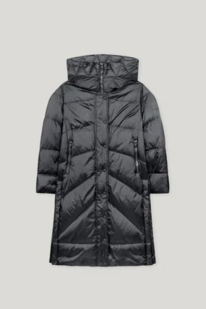 Vācu premium klases apģērbu zīmola Luisa Cerano tumši pelēks mētelis ar dekoratīvu stepējumu un fiksētu kapuci. Izgatavots no viegla poliamīda materiāla ar dūnu pildījumu. Papildināts ar slēptu divvirziena rāvējslēdzēja aizdari un dziļiem sānu šķēlumiem ar spiedpogu aizdari. Akcentēts ar zīmola logotipa emblēmu uz piedurknes.