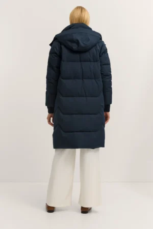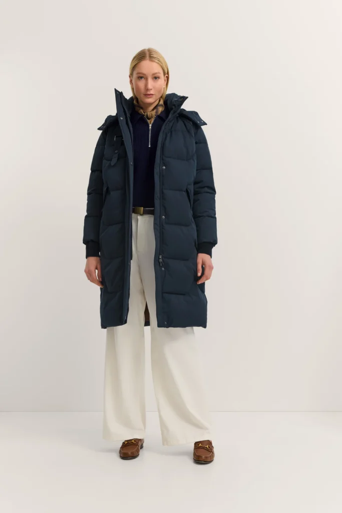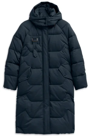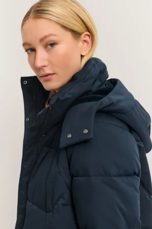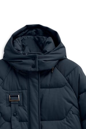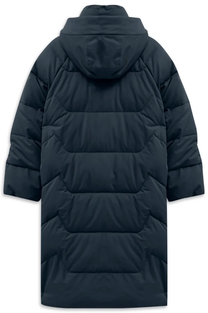 Vācu modes zīmola Bugatti polsterēts sieviešu mētelis tumši zilā krāsā ar dekoratīvu horizontālo stepējumu. Izgatavots no viegli kopjama augstākās kvalitātes poliestera materiāla ar matētu struktūru. Papildināts ar noņemu mākslīgās kažokādas kapuci un stilīgām apdares detaļām.