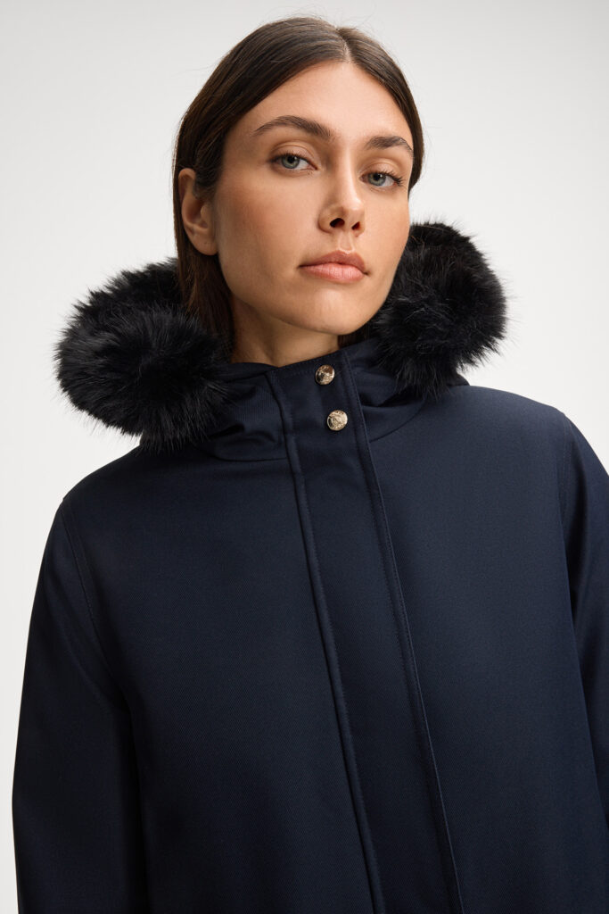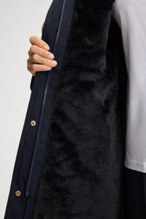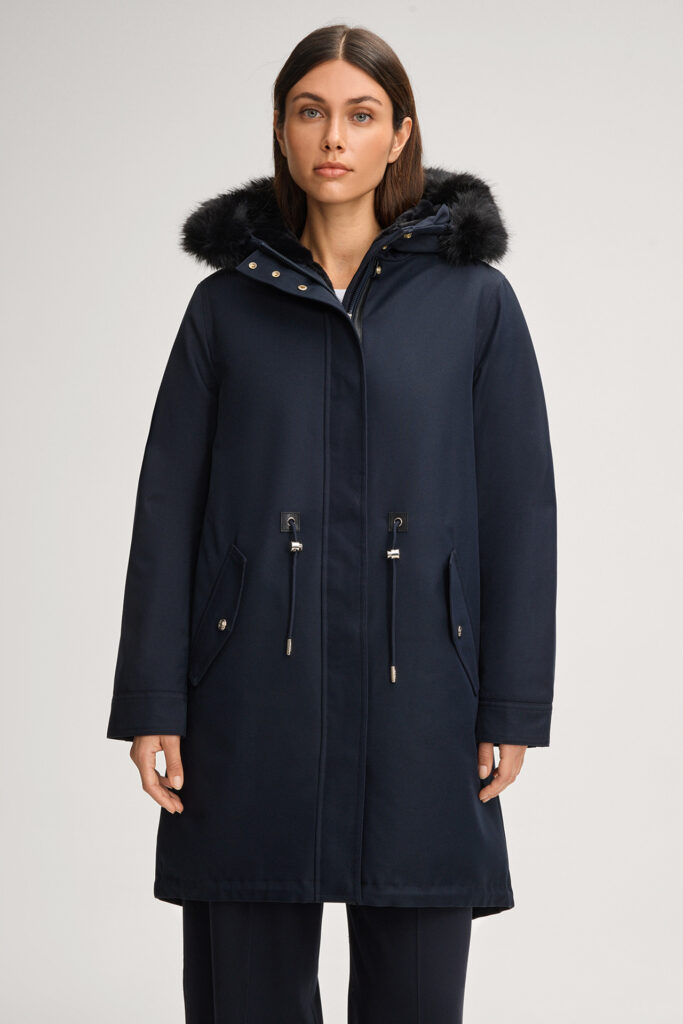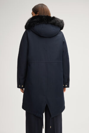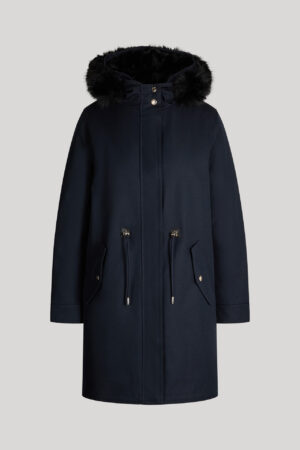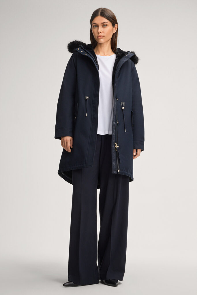Vācu modes zīmola Joop! tumši zila sieviešu virsjaka jeb parka ar kapuci un savelkamu jostasvietu. Siltināta ar mākslīgās kažokādas oderi. Papildināta ar noņemamu mīksto kapuces apdari. Akcentēta ar zelta krāsas metāla un zīmola logotipa detaļām.