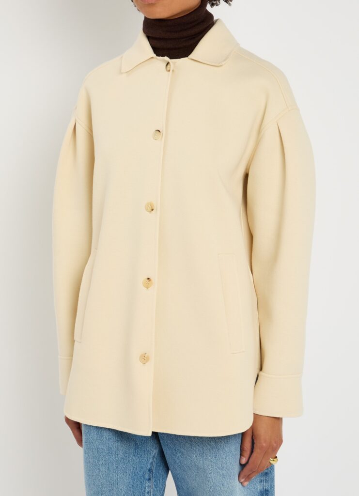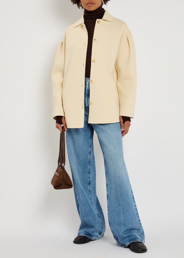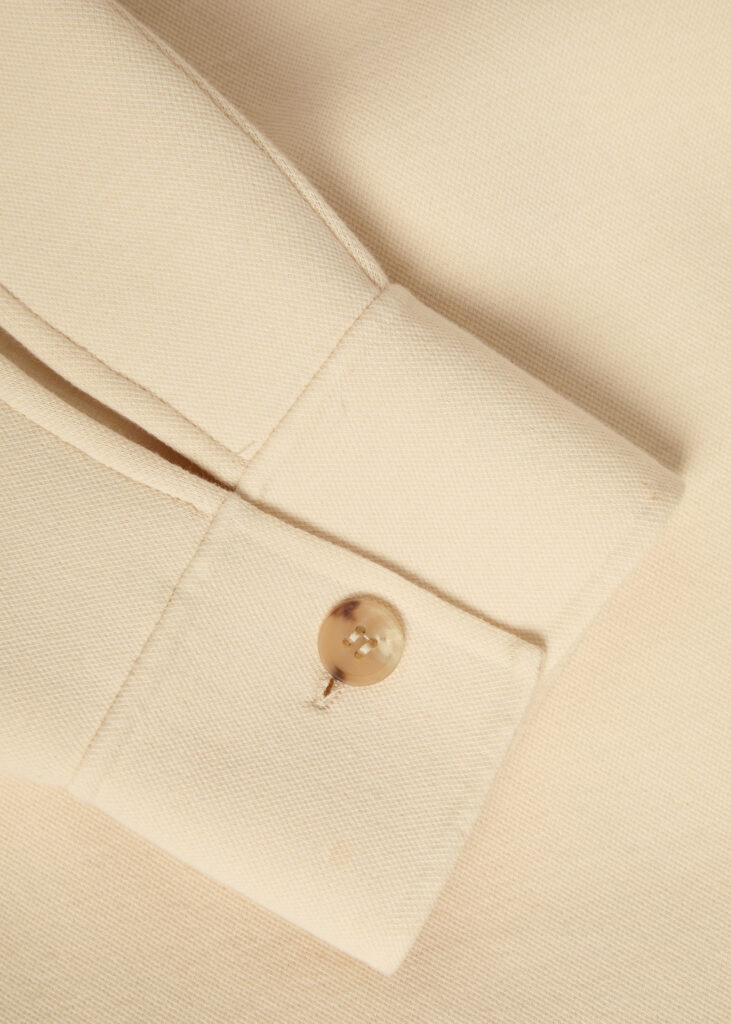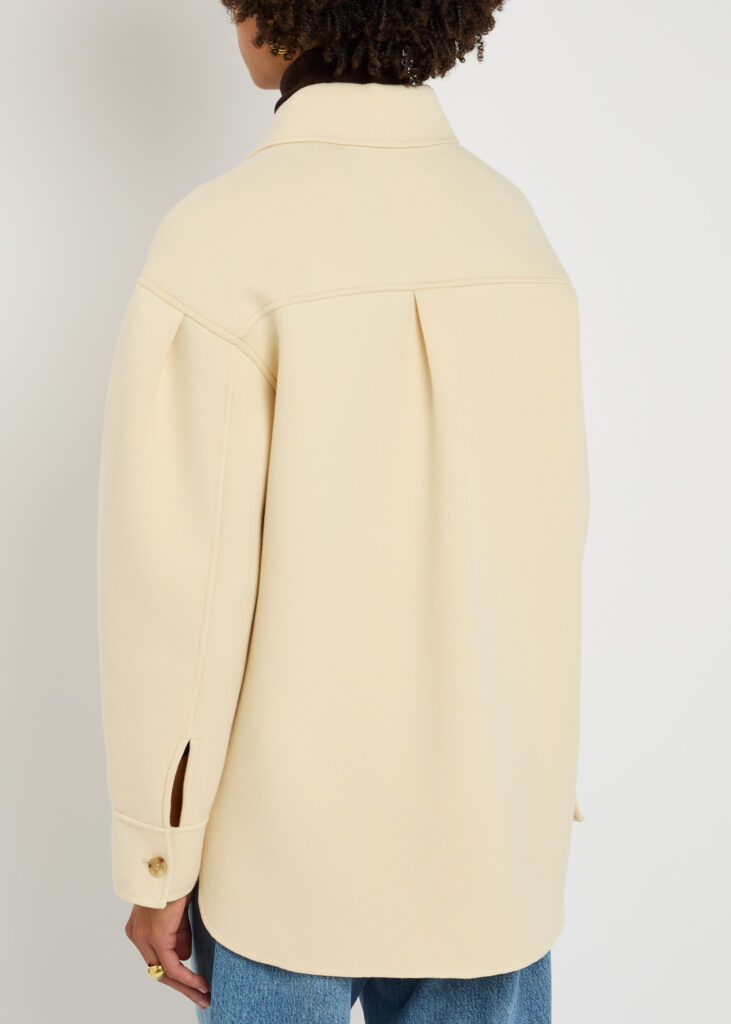 Itāļu modes zīmola MM by Max Mara stilīga sieviešu kreklveida jaka gaiši bēšā krāsā. Izgatavota no blīva un bieza kokvilnas maisījuma materiāla. Papildināta ar dekoratīvām ielocēm, iešūtām kabatām un noapaļotiem sānu šķēlumiem.