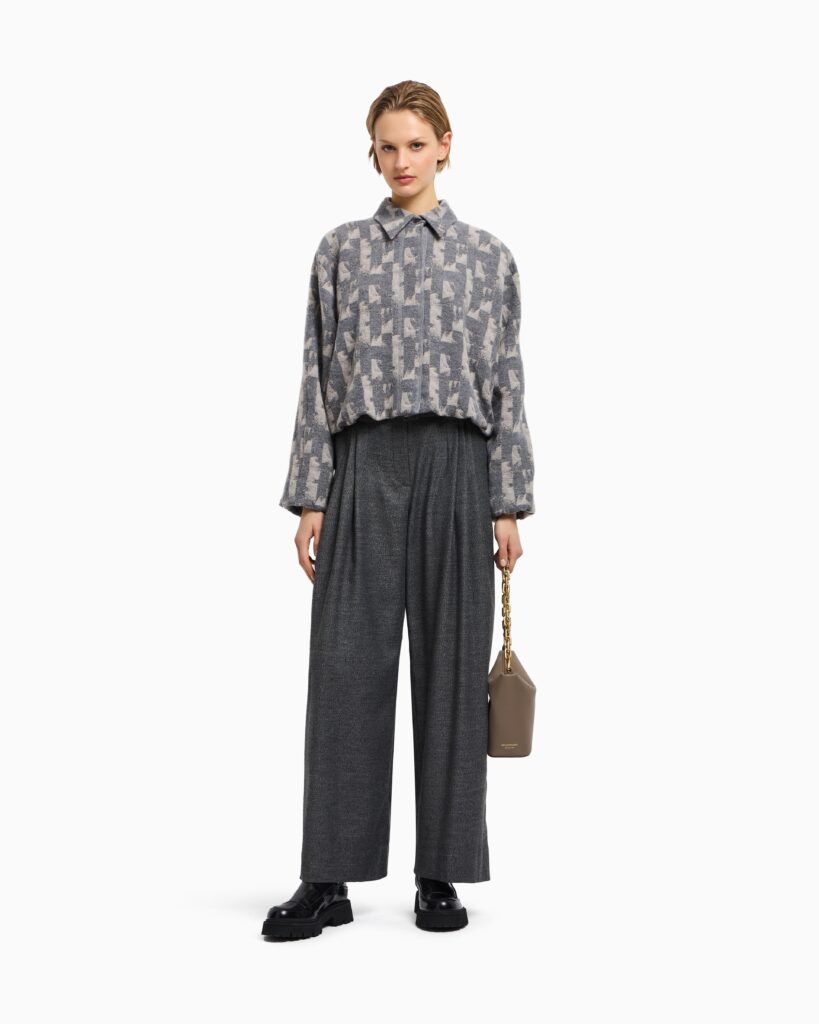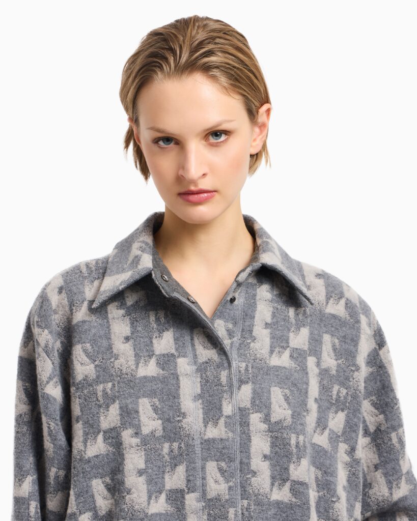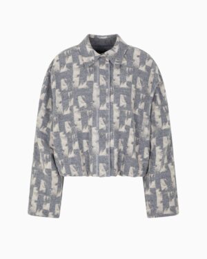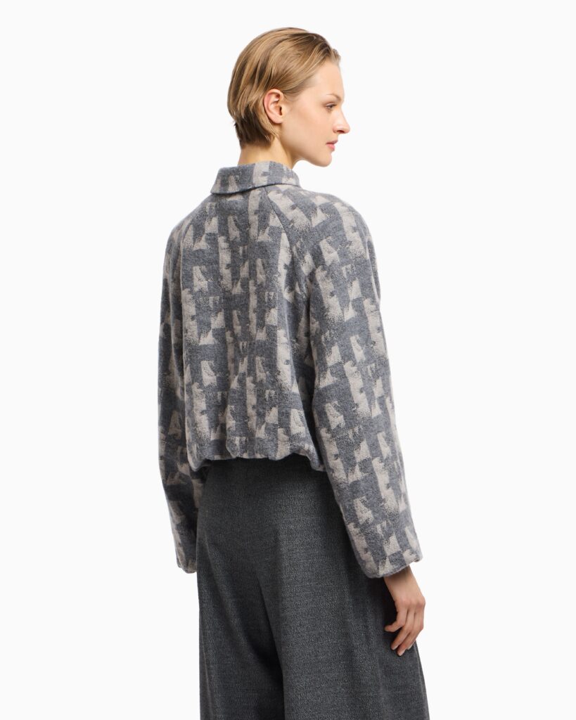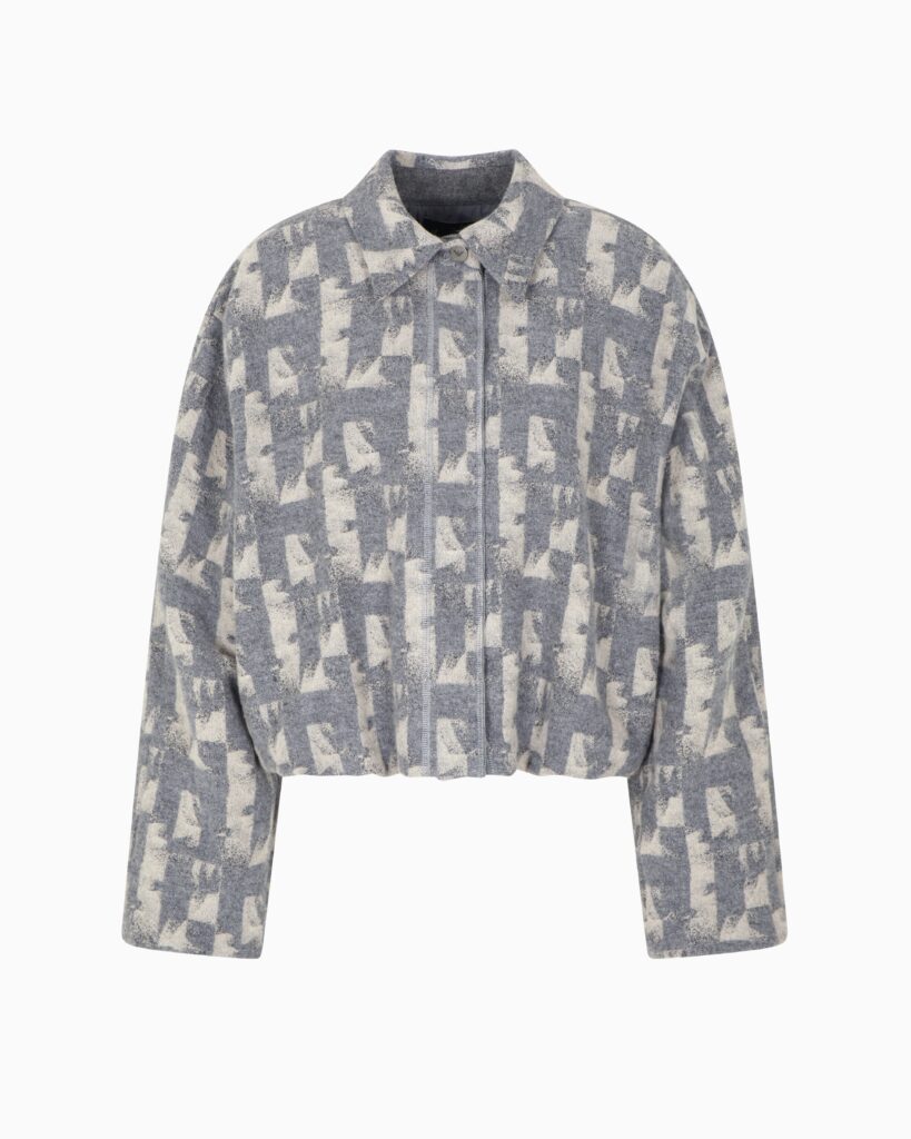 Itāļu luksusa zīmola Emporio Armani unviversāls un stilīgs sieviešu bluzons pelēkā krāsā ar neregulāru ģeometrisko motīvu rakstu. Izgatavots no mīksta jaunvilnas un viskozes maisījuma materiāla. Papildināts ar klasisku apkakli, slēptu siedpogu aizdari un tafta oderi, kā arī zīmola logotipa- ērgļa akcentu uz apkales pogas.