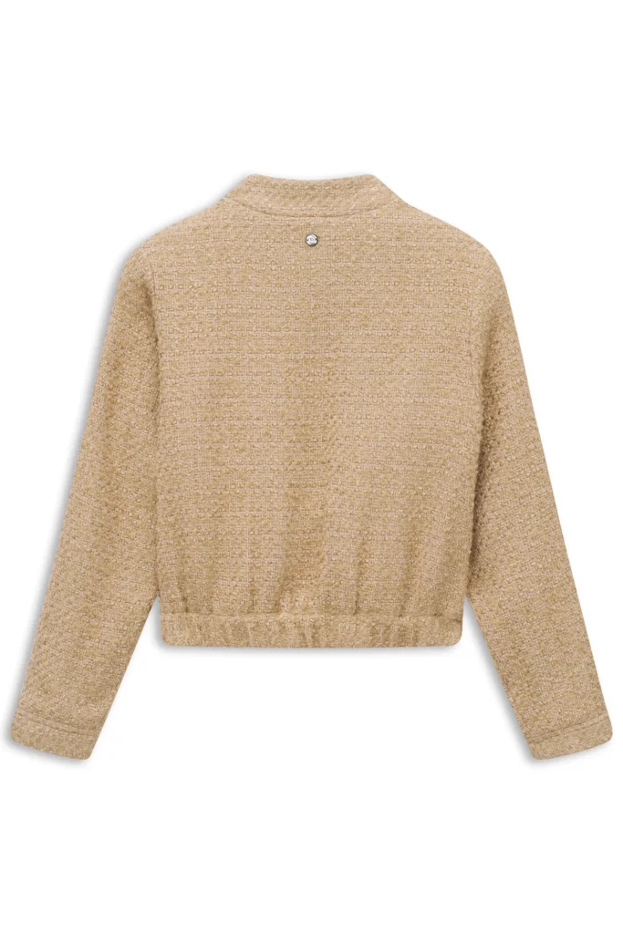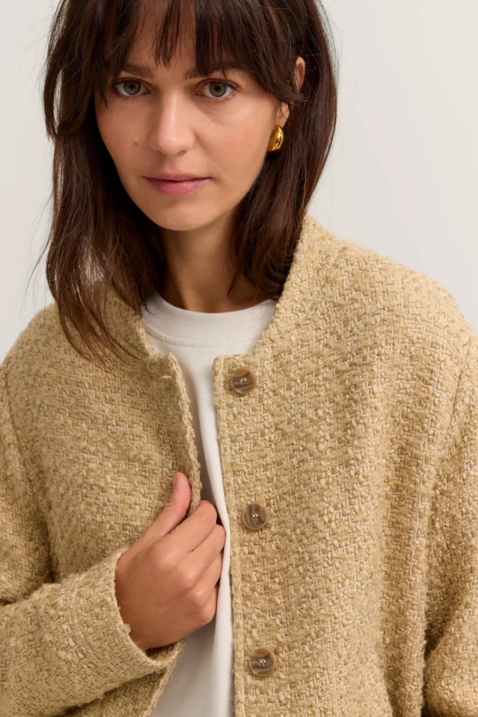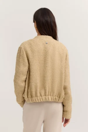 Vācu modes zīmola Bugatti bēša sieviešu bluzona stila jaka ar pogu aizdari. Izgatavota no dekoratīva augstākās kvalitātes materiālu maisījuma ar buklē tekstūru. Papildināta ar koledžas stila apkakli, elastīgu apakšmalu un smalku zīmola logotipa emblēmu mugurpusē.