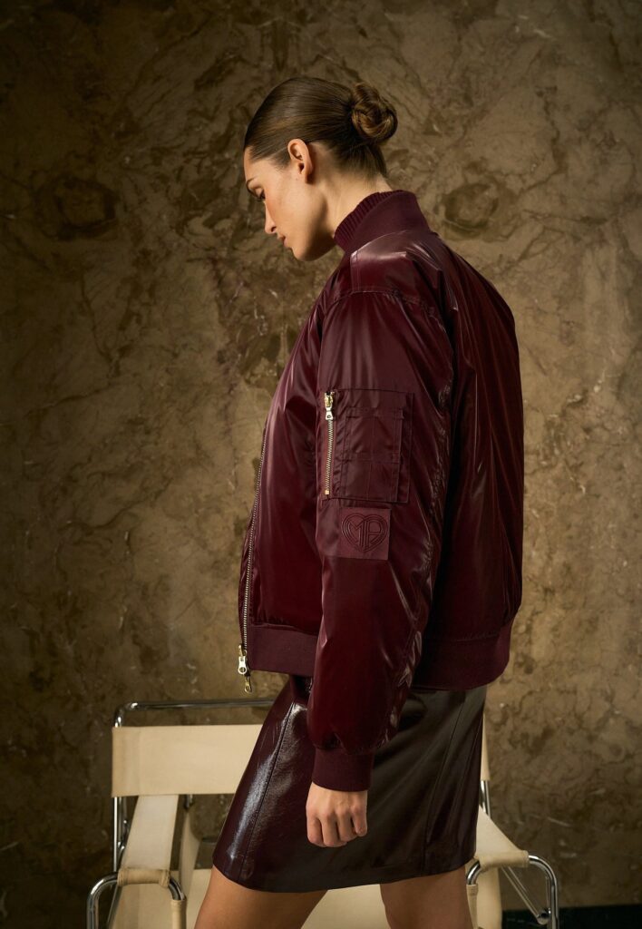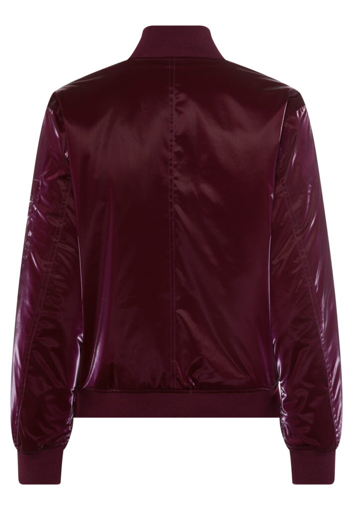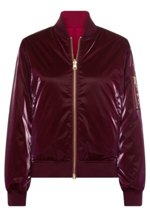 Vācu modes zīmola Marc Aurel viegli siltināta, divpusēji nēsājama sieviešu koledžas stila virsjaka ar rāvējslēdzēja aizdari. Viena puse izgatavota no ūdeni atgrūdoša un vēju aizturša materiāla bordo krāsā ar satīna mirdzumu, otra – no matēta materiāla tumši sarkanā krāsā. Papildināta ar uzšūtu piedurknes kabatu, abpusējām spiedpogu aizdares sānu kabatām un rievota adījuma apdari.