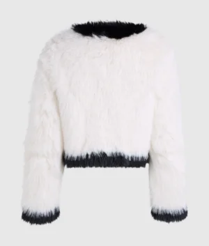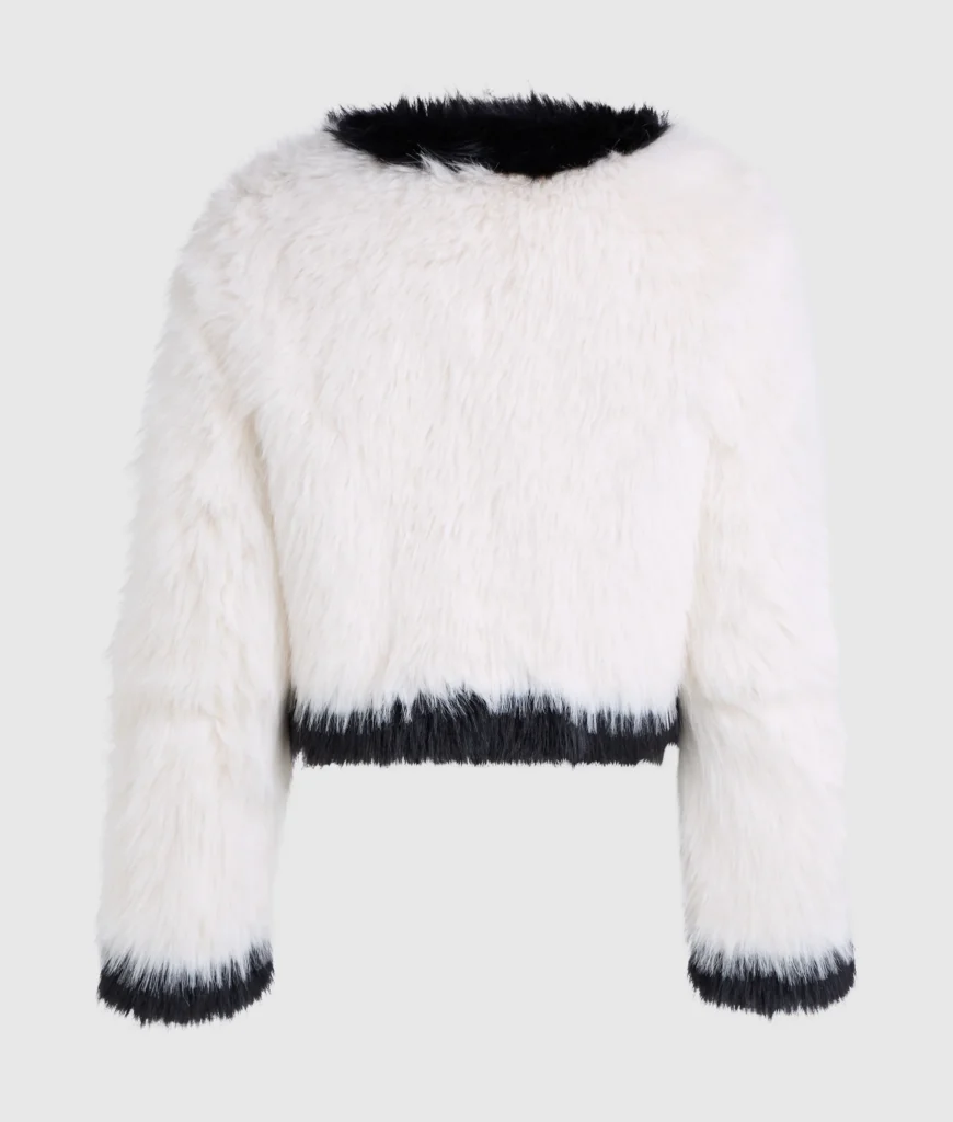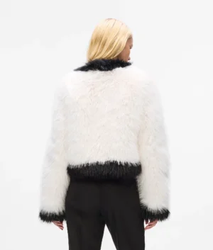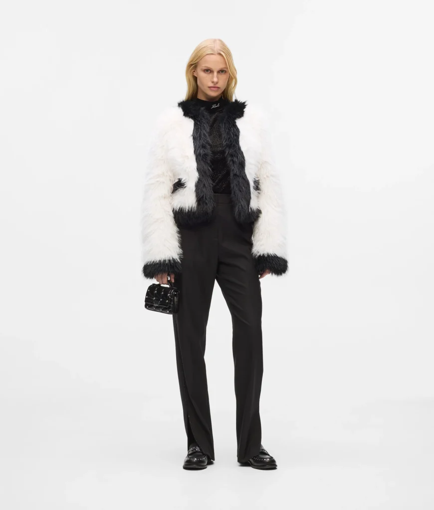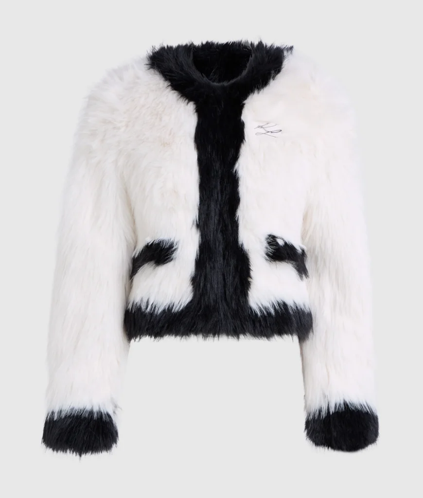Vācu luksusa zīmola Karl Lagerfeld ekstravaganta īsa piegriezuma sieviešu virsjaka no mākslīgās kažokādas ar izteiksmīgu tekstūru. Papildināta ar slēptu āķu aizdari un kontrastējošu apdari. Akcentēta ar sudraba krāsas zīmola monogrammas piespraudi.