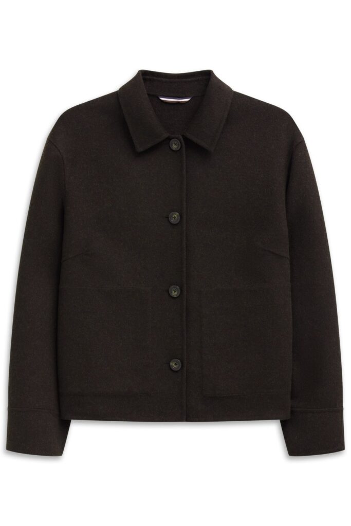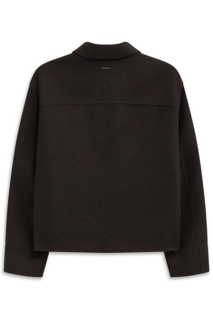 Vācu modes zīmola Bugatti tumši brūna sieviešu virsjaka bez oderes. Izgatavota no mīksta un bieza vilnas maisījuma auduma. Papildināta ar pogu aizdari un kreklveida apkakli, kā arī smalku zīmola logotipa metāla akcentu mugurpusē.