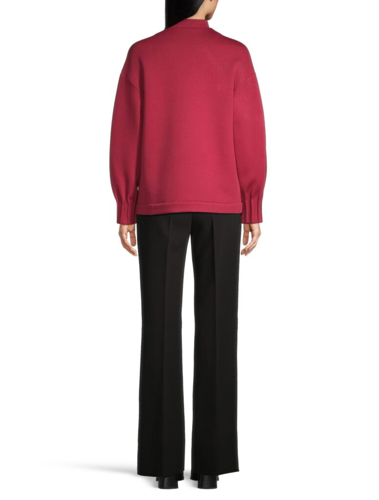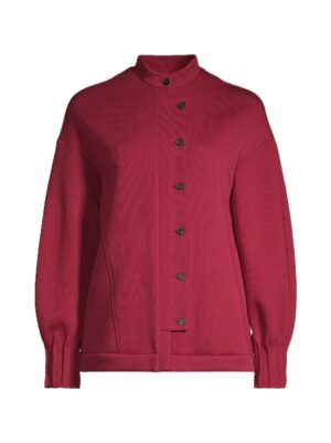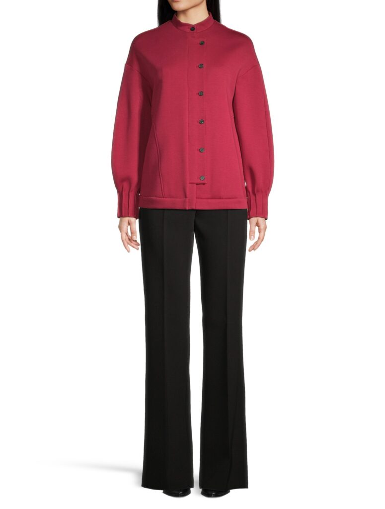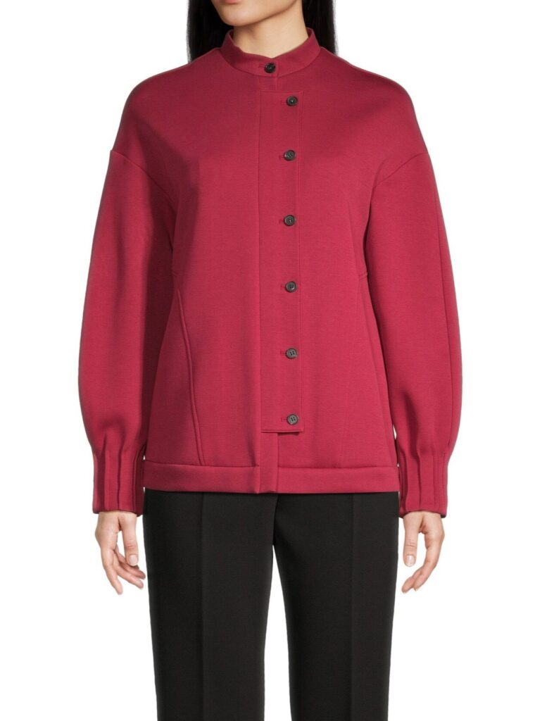 Itāļu modes zīmola MM by Max Mara tumši sarkana skulpturāla dizaina sieviešu jaka ar paaugstinātu apkakli un pogu aizdari. Izgatavota no bieza un blīva kokvilnas maisījuma materiāla. Papildināta ar dekoratīvu krokojumu un rāvējslēdzēju aizdari aprocēs.