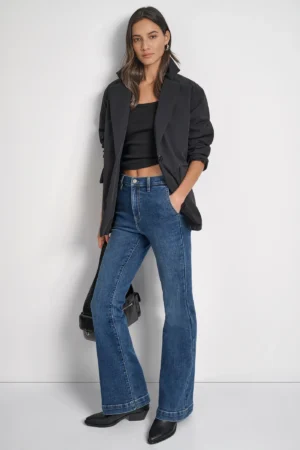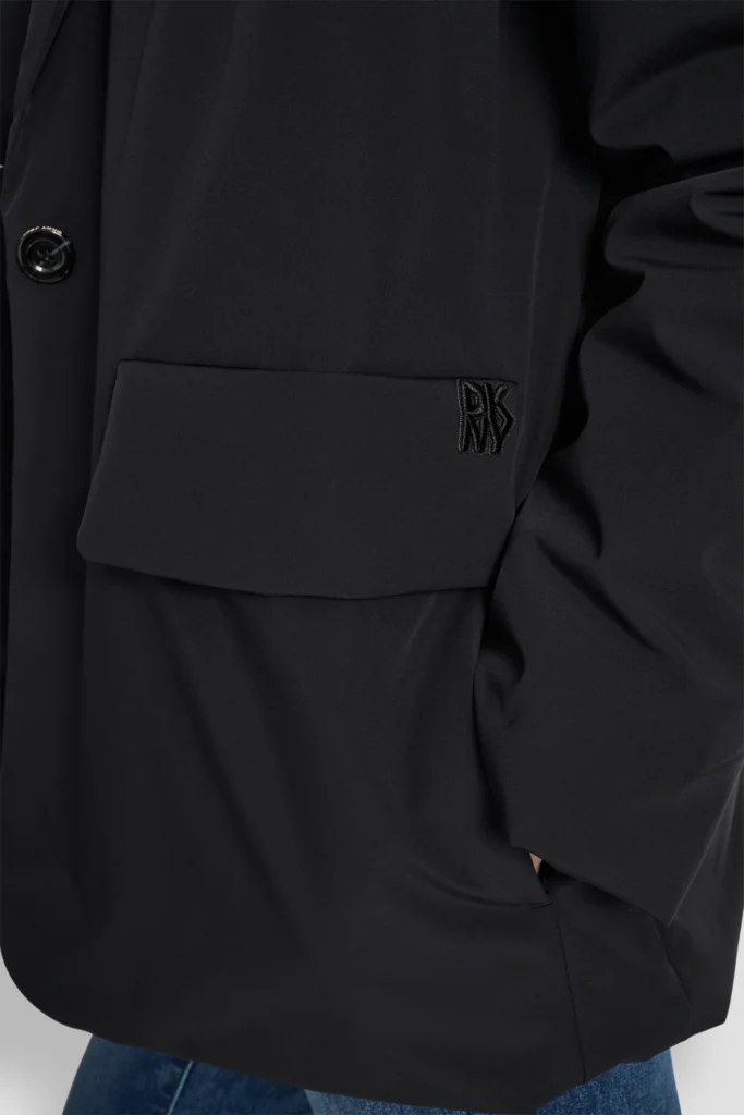 ASV modes zīmola DKNY melna sieviešu žaketes stila virsjaka ar viegli polsterētu struktūru. Izgatavota no elastīga neilona materiāla. Papildināta ar iešūtām sānu kabatām un vientoņa logo izšuvumu uz dekoratīvā atloka.