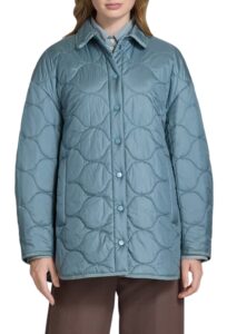 Vācu luksusa zīmola Karl Lagerfeld zeltaini bēša sieviešu virsjaka ar dekoratīvu logo dizaina stepējumu un pērlīšu apdari. Papildināta ar noņemamām piedurknēm un kontrastējošu, elastīgu apdari.