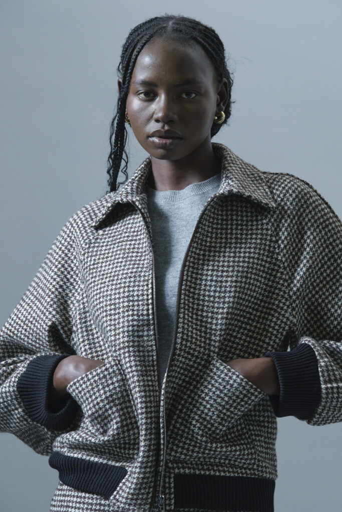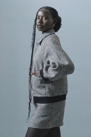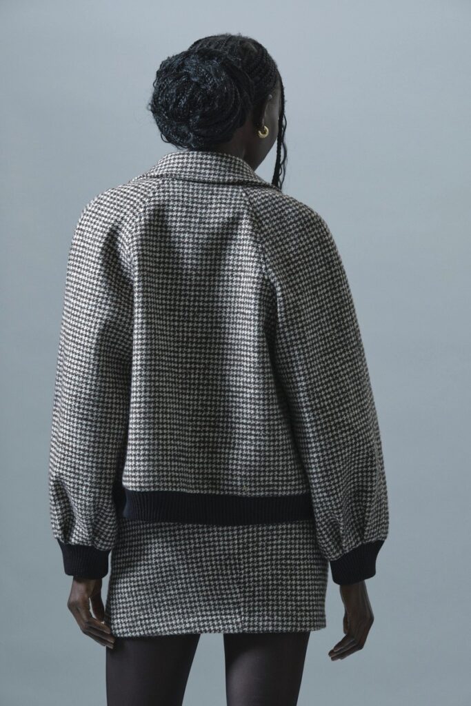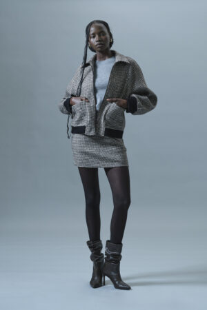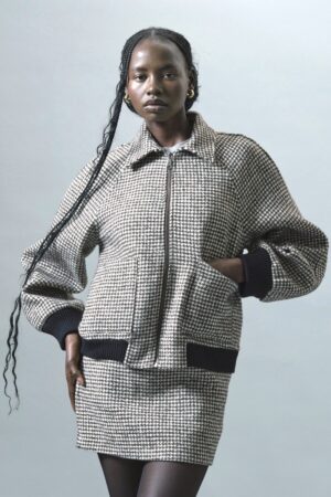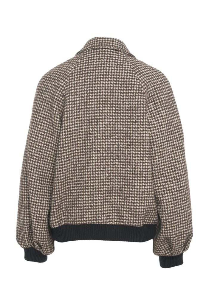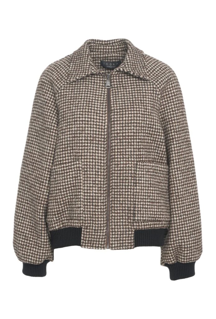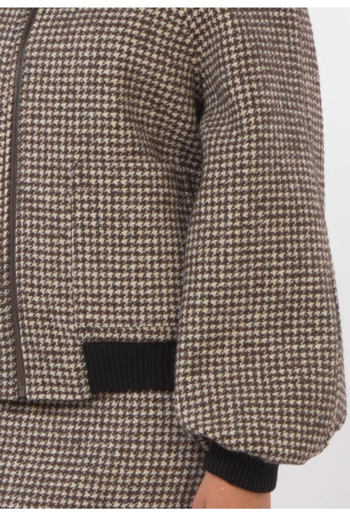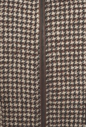 Itāļu modes zīmola ICONA by KAOS komfortabla un stilīga sieviešu virsjaka ar rāvējslēdzēja aizdari. Izgatavota no bieza raupjas tekstūras materiāla ar grafisku rakstu tumši brūnā krāsā. Papildināta ar uzšūtām sānu kabatām un melnu rievota adījuma apdari.