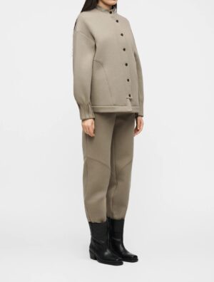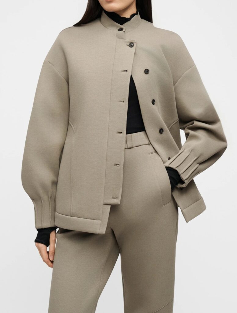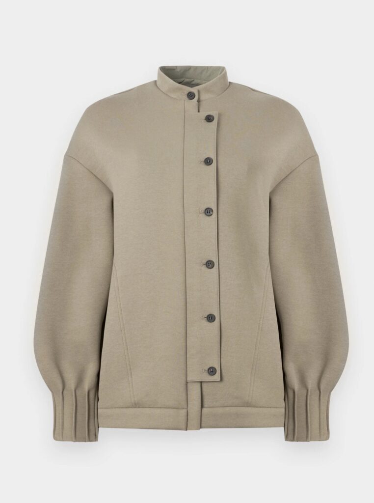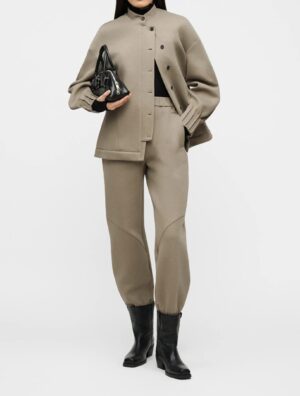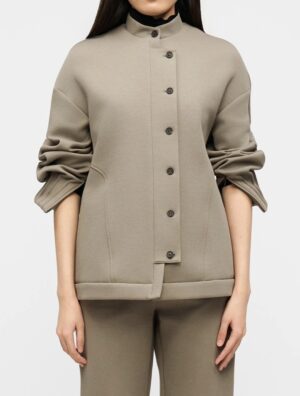 Itāļu modes zīmola MM by Max Mara zaļganpelēka skulpturāla dizaina sieviešu jaka ar paaugstinātu apkakli un pogu aizdari. Izgatavota no bieza un blīva kokvilnas maisījuma materiāla. Papildināta ar dekoratīvu krokojumu un rāvējslēdzēju aizdari aprocēs.