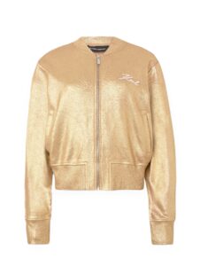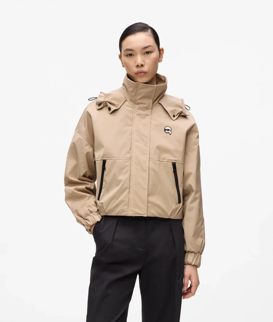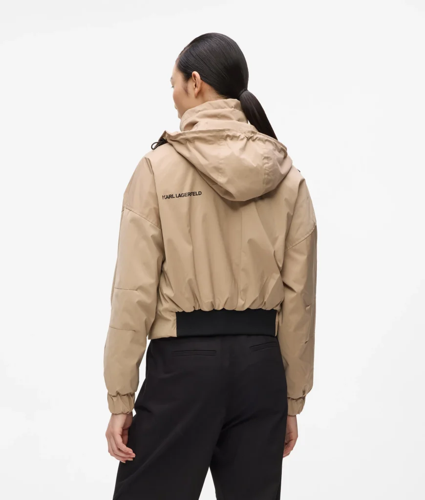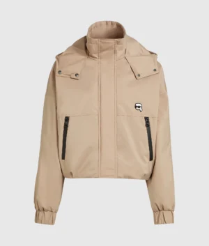 Vācu luksusa zīmola Karl Lagerfeld tumši bēša sieviešu vējjaka ar stepētu oderi un savelkamu kapuci. Izgatavota no elpojoša, ūdeni un vēju aizturoša materiāla. Papildināta ar augstu apkakli, kā arī iekšpusē savelkamu un mugurpusē elastīgu apakšmalu. Akcentēta ar kontrastējošām apdares un zīmola logotipa detaļām.