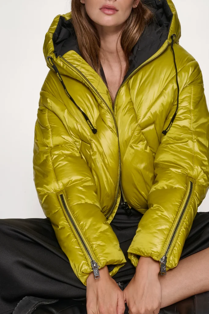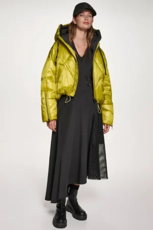 ASV modes zīmola DKNY īsa sieviešu virsjaka ar sasienamu kapuci spilgti zaļgandzeltenā krāsā. Izgatavota no viegla neilona materiāla ar siltu polsterējumu un dekoratīvu stepējumu. Papildināta ar rāvējslēdzēju aizdari aproču daļā un savelkamu apakšmalu. Akcentēta ar kontrastējošām apdares un zīmola logotipa detaļām, kā arī apaļu vientoņa logo emblēmu uz piedurknes.