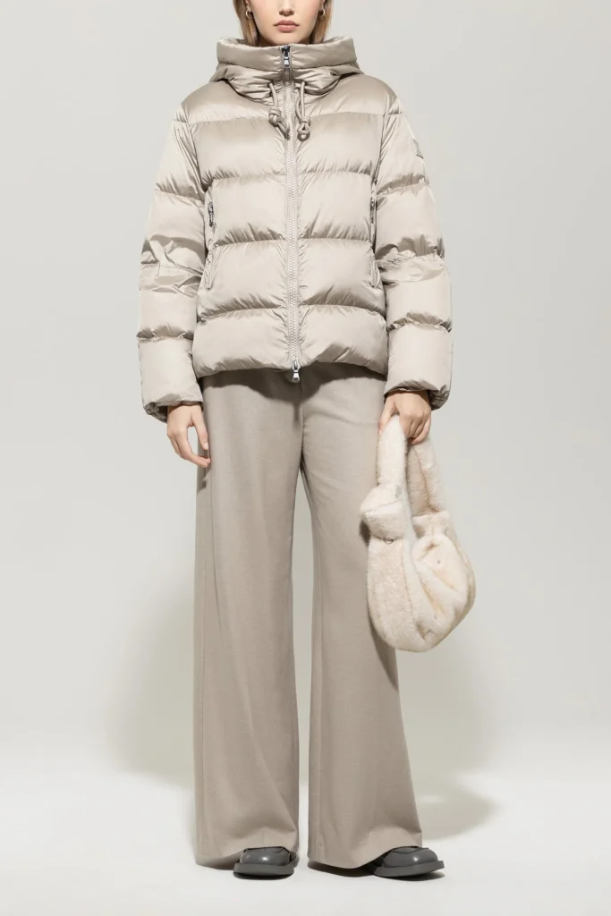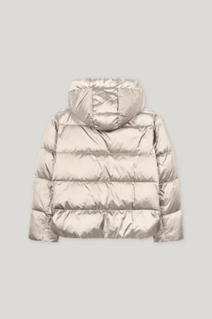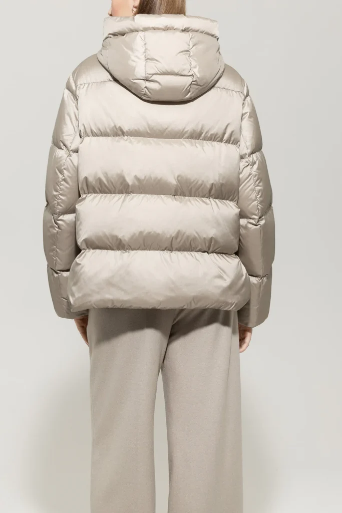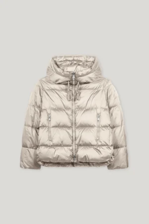 Vācu premium klases apģērbu zīmola Luisa Cerano stilīga stepētā sieviešu virsjaka gaiši pelēcīgi bēšā krāsā. Izgatavota no viegla poliamīda materiāla ar satīna spīdumu un dūnu pildījumu. Papildināta ar divvirziena rāvējslēdzēja aizdari, savelkamu kapuci un noapaļotiem sānu šķēlumiem ar spiedpogu aizdari. Akcentēta ar zīmola logotipa emblēmu uz piedurknes.