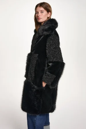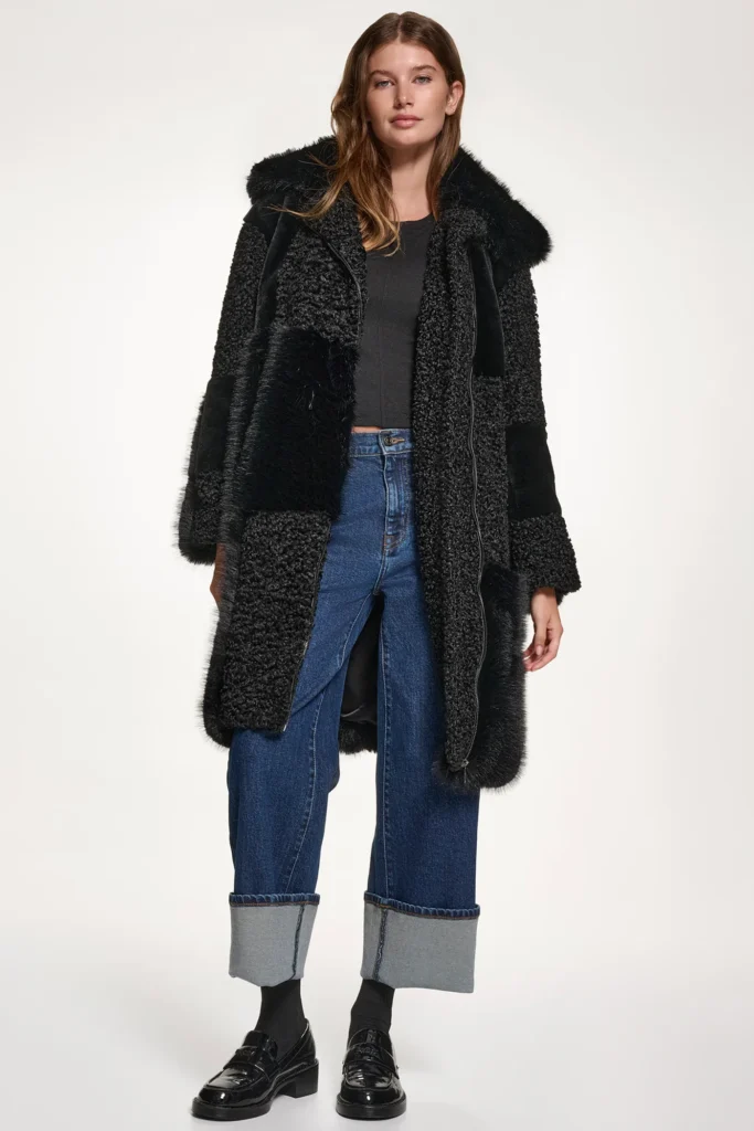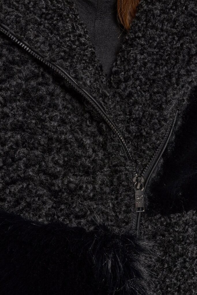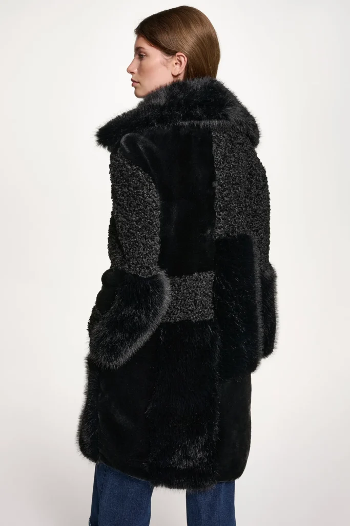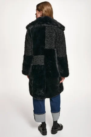 ASV modes zīmola DKNY melna sieviešu mēteļveida virsjaka ar patchwork stila struktūru. Izgatavota no divu tekstūru mākslīgās kažokādas. Papildināta ar divvirziena rāvējslēdzēja aizdari un kreklveida apkakli.