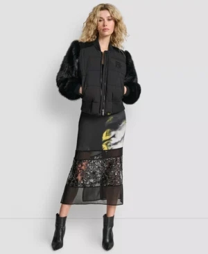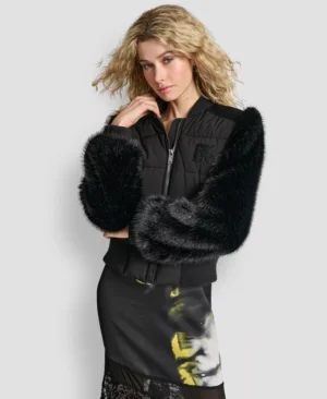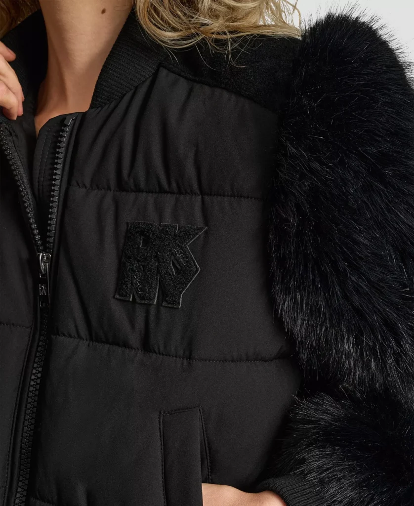ASV modes zīmola DKNY melna īsa piegriezuma sieviešu virsjaka ar stepētu vestes daļu un rāvējslēdzēja aizdari. Papildināta ar mākslīgās kažokādas piedurknēm, kā arī smalki rievotu apkakles, aproču un apakšmalas apdari. Akcentēta ar izsmalcinātām zīmola logotipa detaļām.