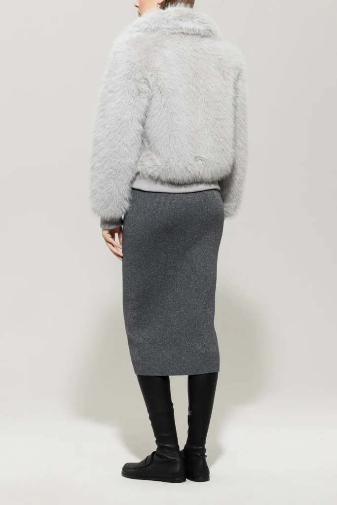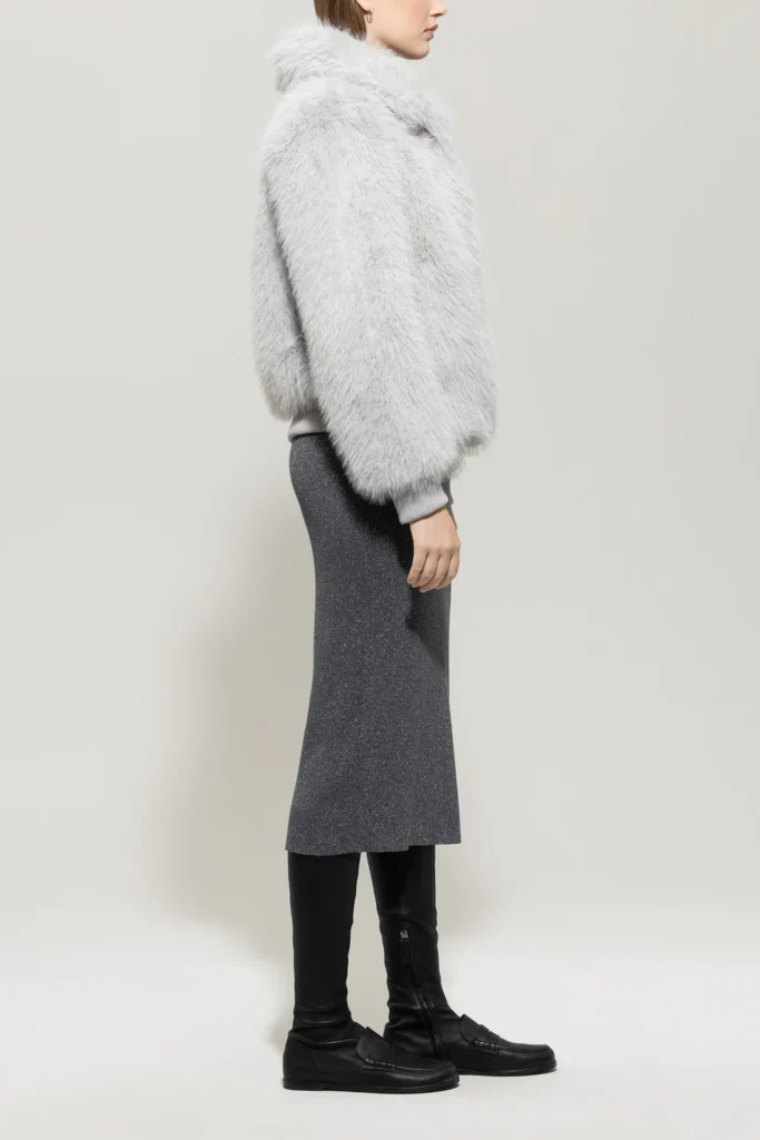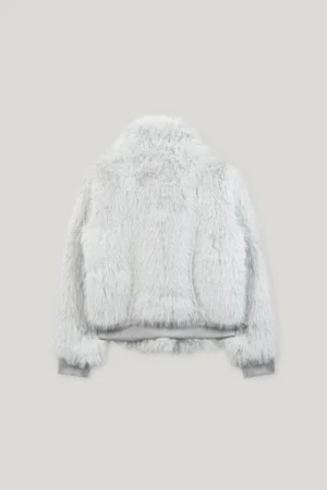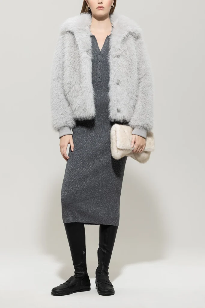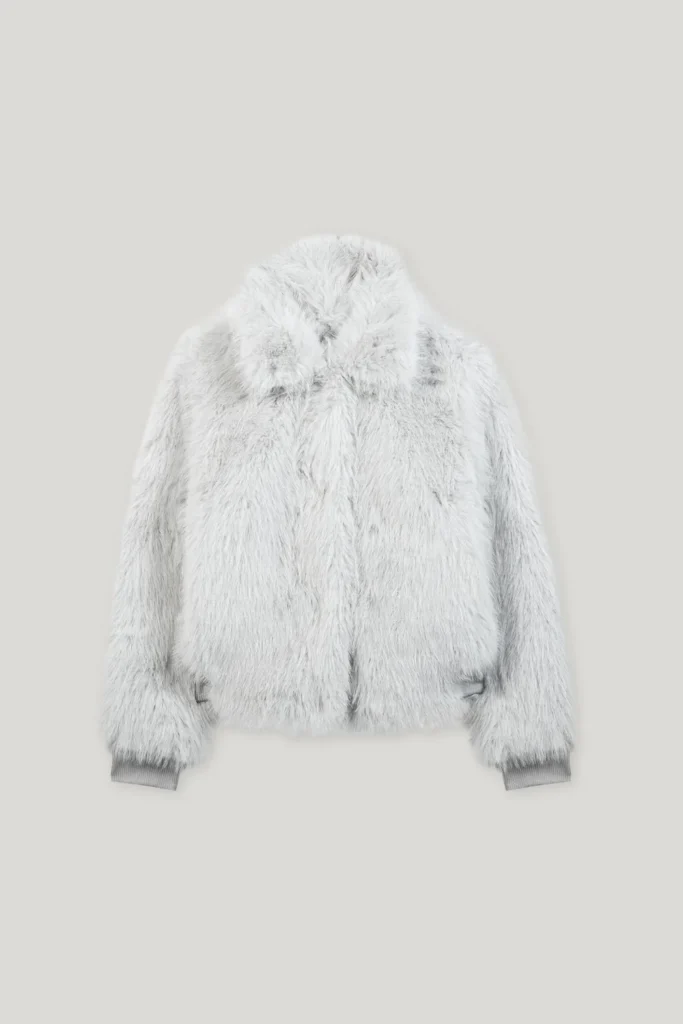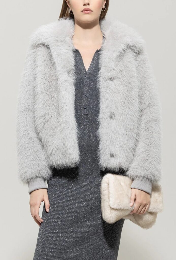 Vācu premium klases apģērbu zīmola Luisa Cerano gaiši pelēka bluzona stila virsjaka sievietēm. Izgatavota no mīkstas mākslīgās kažokādas. Papildināta ar rievota adījuma apakšmalas un aproču apdari.
