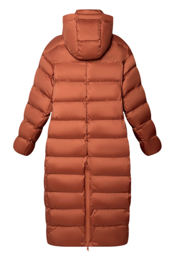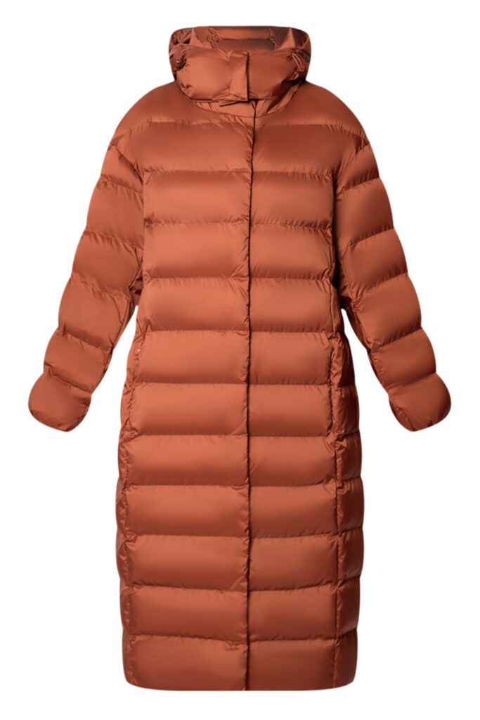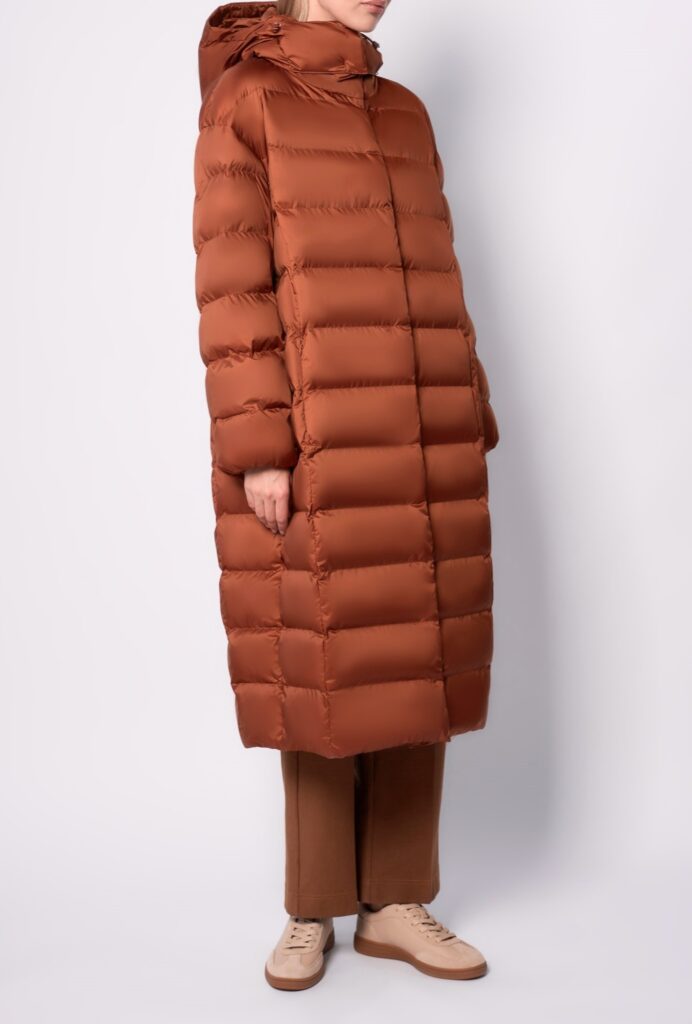 Itāļu modes zīmola MM by Max Mara stepēts sieviešu mētelis košā, rudi brūnā krāsā ar slēptu divvirziena rāvējslēdzēja un spiedpogu aizdari. Papildināts ar noņemamu kapuci un rāvējslēdzēja aizdares šķēlumu mugurpusē.