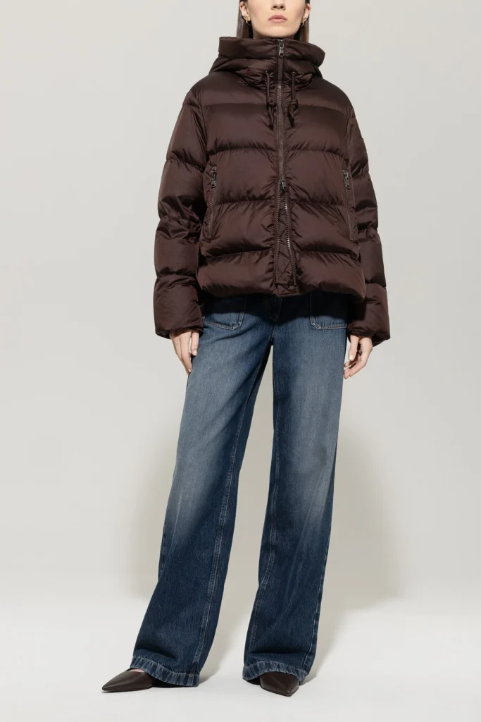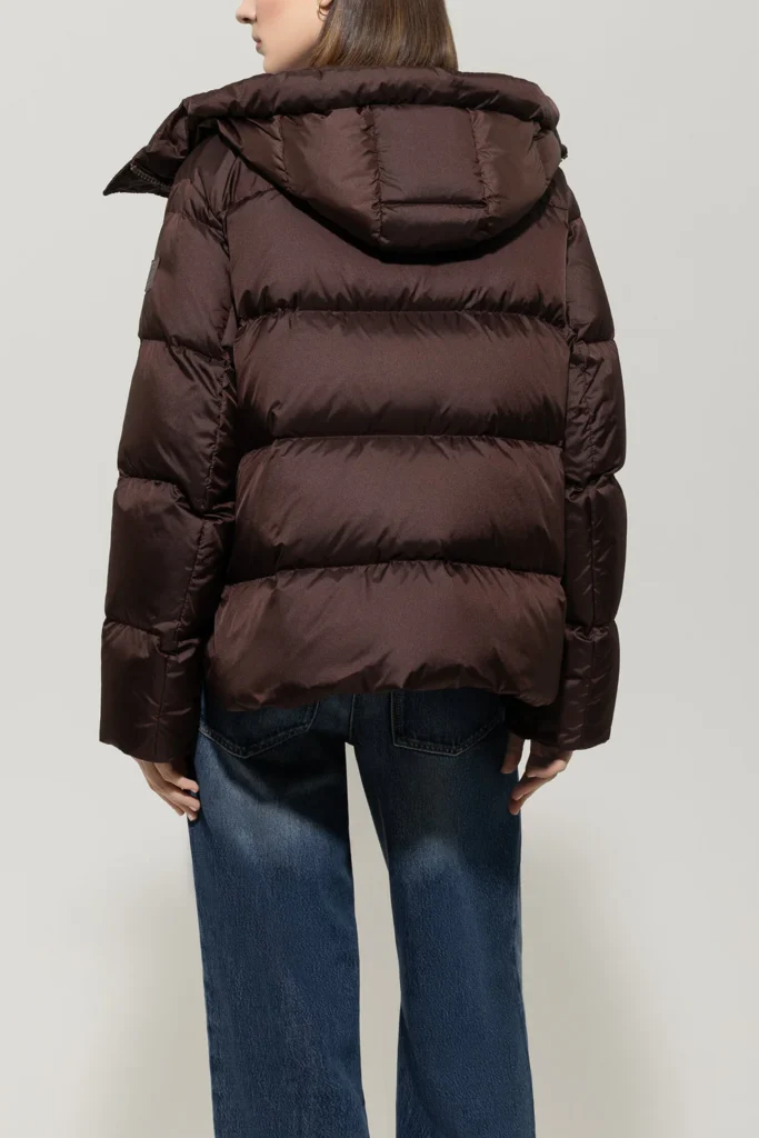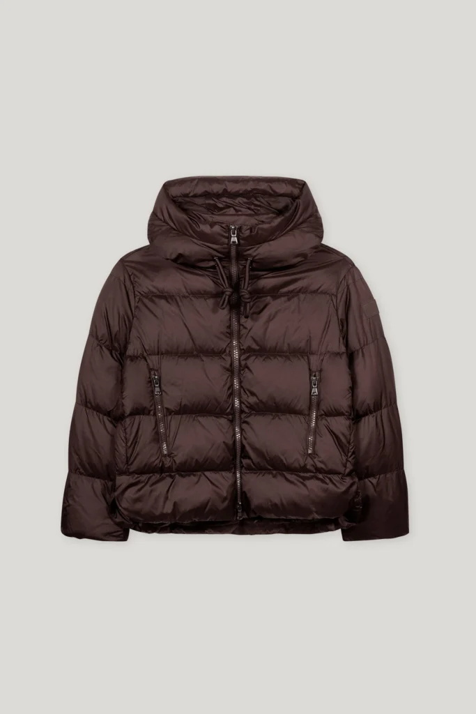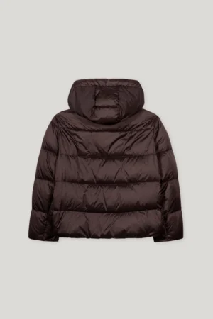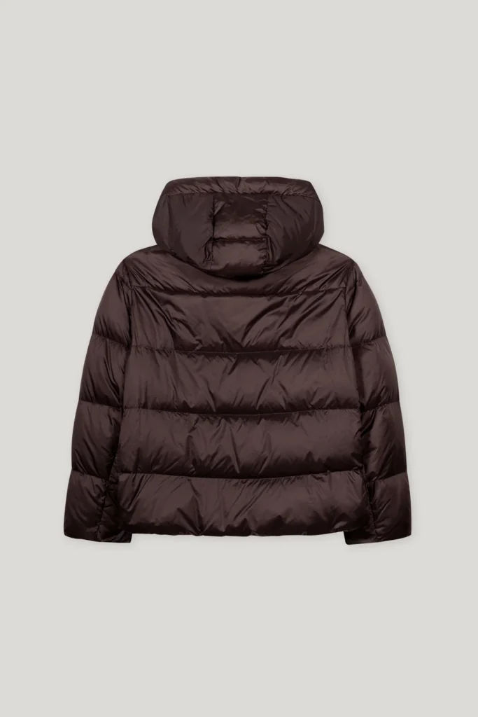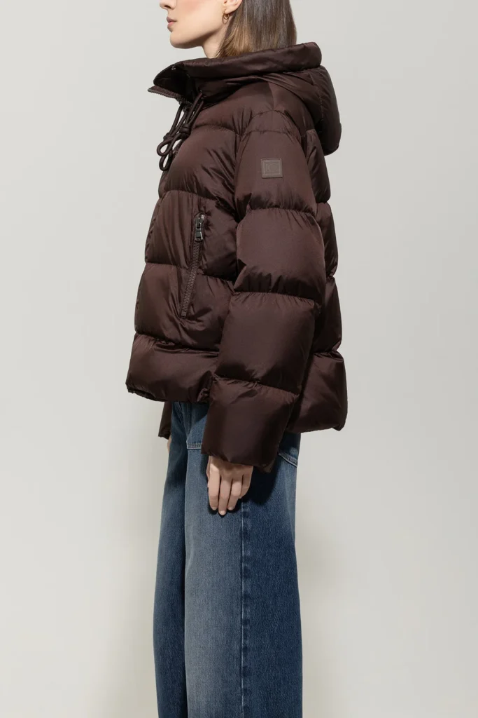 Vācu premium klases apģērbu zīmola Luisa Cerano stilīga stepētā sieviešu virsjaka šokolādes brūnā krāsā. Izgatavota no viegla poliamīda materiāla ar satīna spīdumu un dūnu pildījumu. Papildināta ar divvirziena rāvējslēdzēja aizdari, savelkamu kapuci un noapaļotiem sānu šķēlumiem ar spiedpogu aizdari. Akcentēta ar zīmola logotipa emblēmu uz piedurknes.