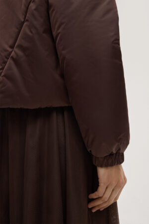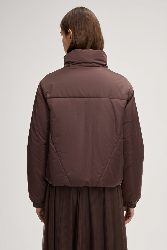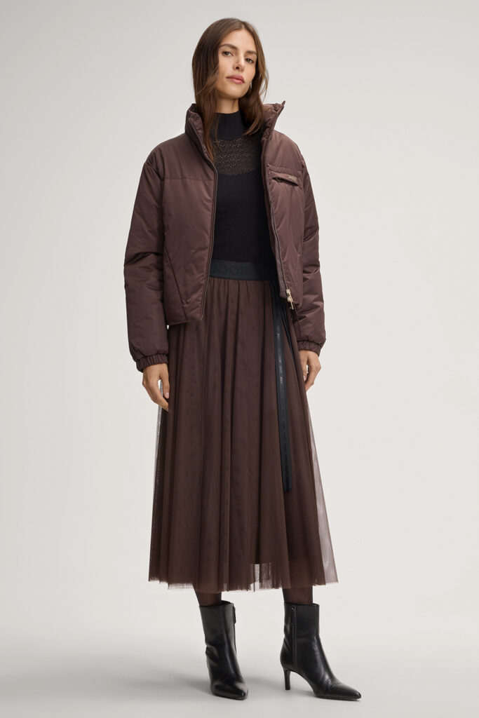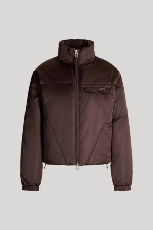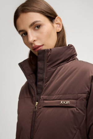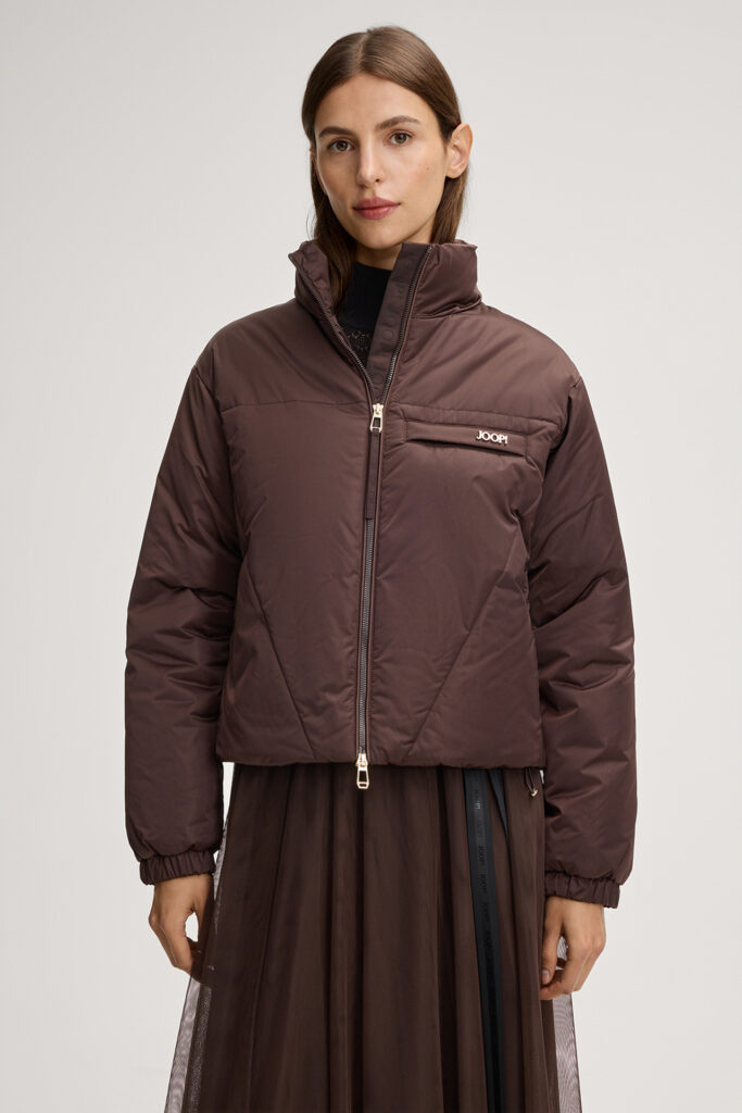 Vācu modes zīmola Joop! moderna dizaina virsjaka ar augstu apkakli šokolādes brūnā krāsā. Papildināta ar divvirziena rāvējslēdzēja aizdari, elastīgām aprocēm un savelkamu apakšmalu. Akcentēta ar iešūtu krūšu kabatu, kā arī zelta krāsas metāla un zīmola logotipa detaļām.
