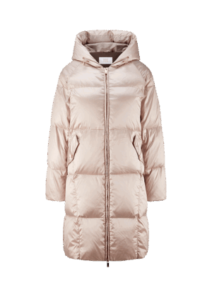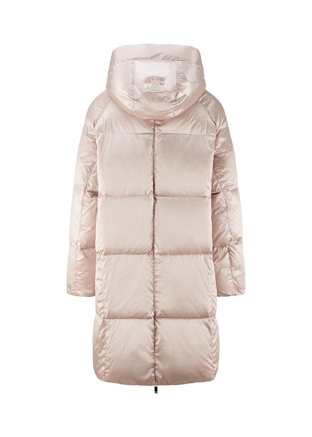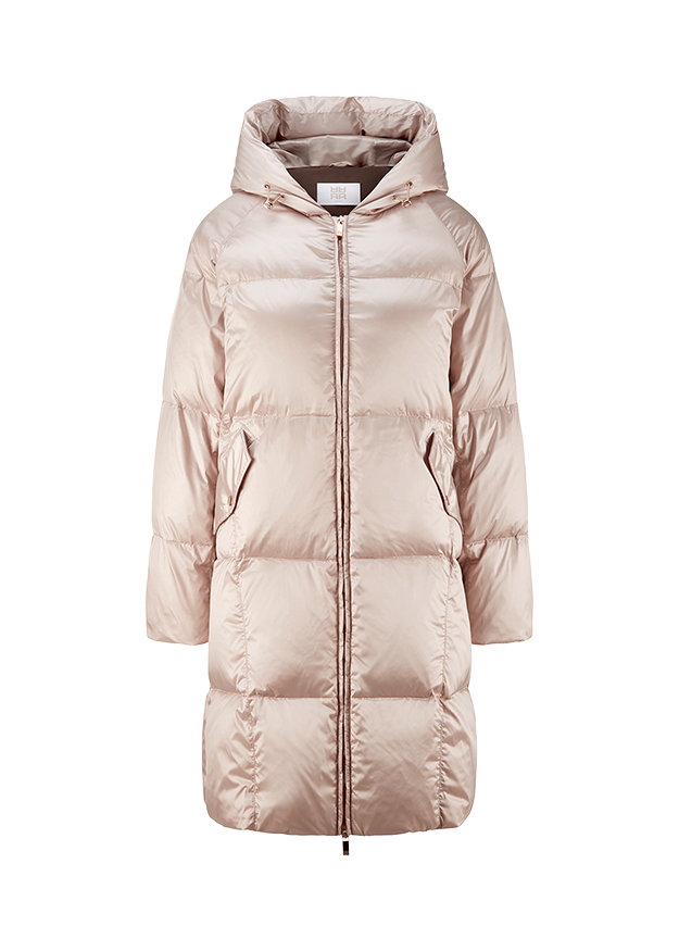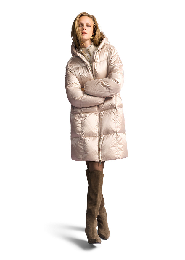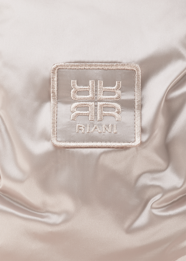 Vācu modes zīmola Riani stepēts sieviešu mētelis jeb garā virsjaka krēmīgi bēšā krāsā. Papildināta ar divvirziena rāvējslēdzēja aizdari, savelkamu kapuci un elastīgām iekšējām aprocēm. Akcentēta ar logo izšuvumu uz kapuces, kā arī zelta krāsas metāla un zīmola logotipa detaļām.