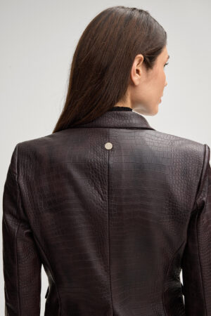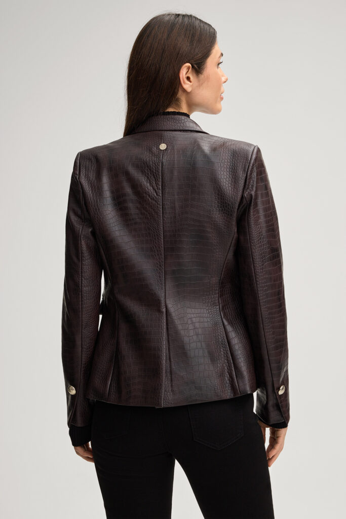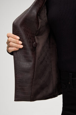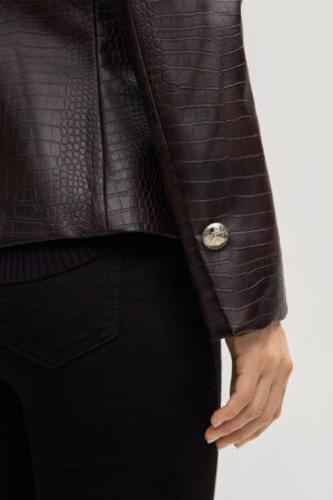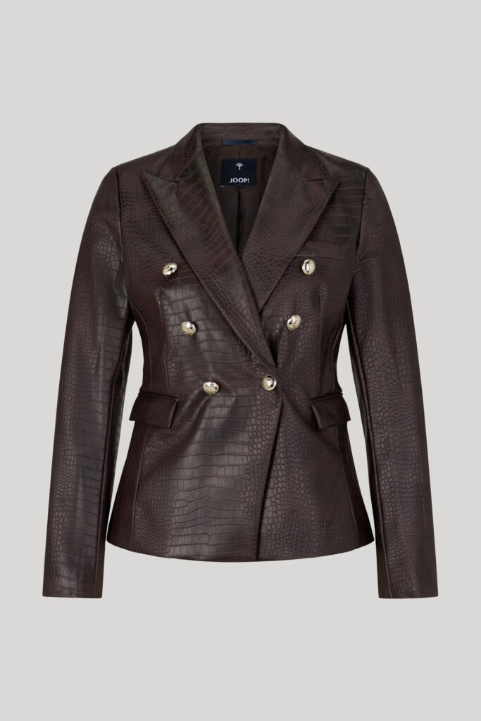 Vācu modes zīmola Joop! viegli pieguļoša sieviešu žakete tumši violeti brūnā tonī. Izgatavota no viskozes materiāla ar krokodia ādas efektu. Papildināta ar smailiem atlokiem un dekoratīvām zīmola dizaina zelta krāsas pogām.