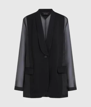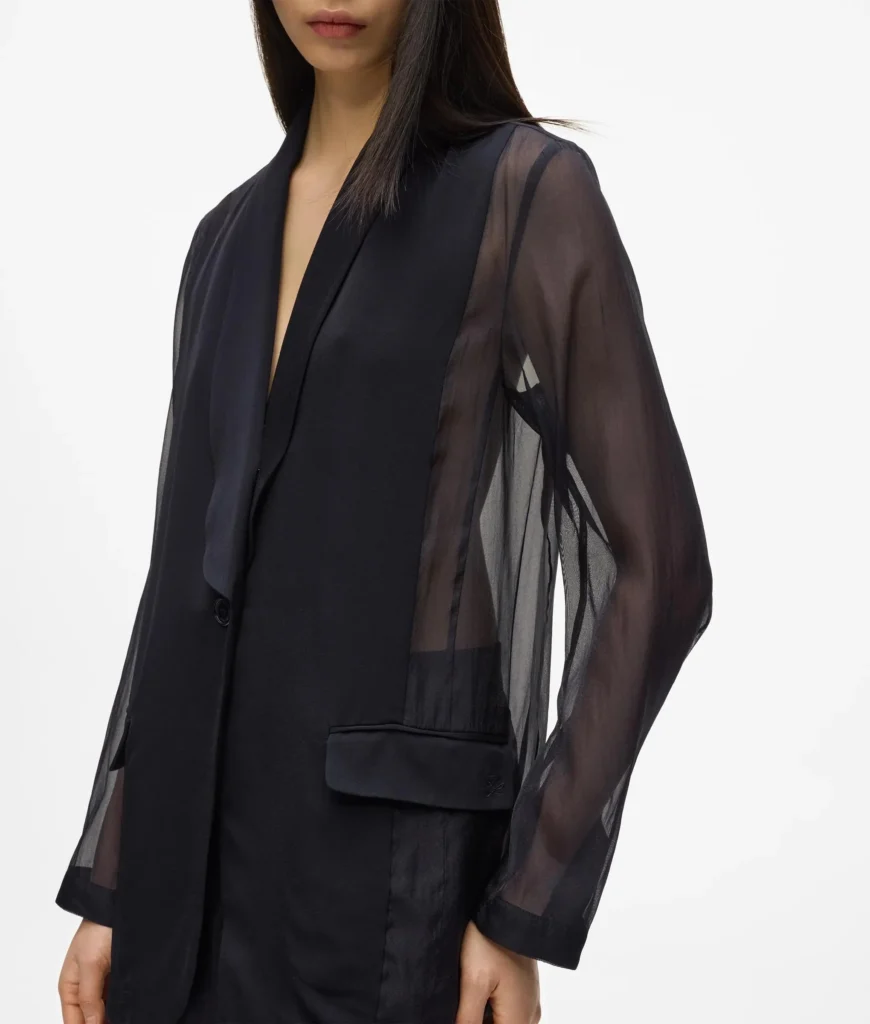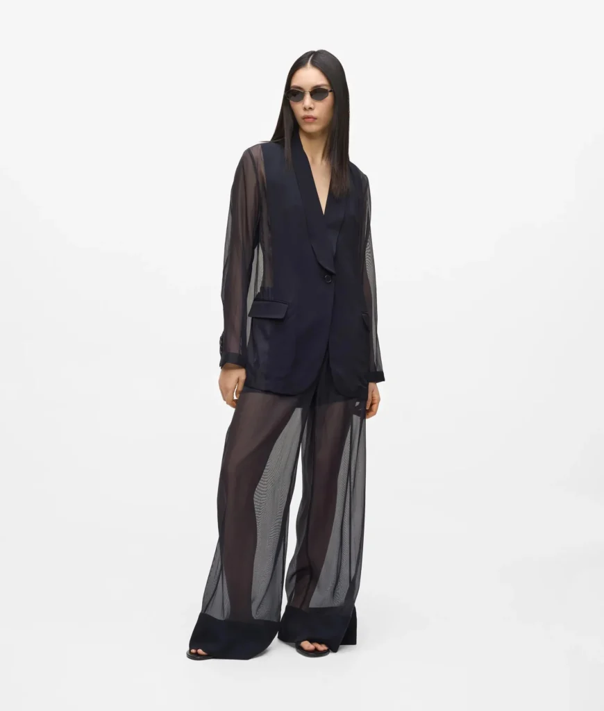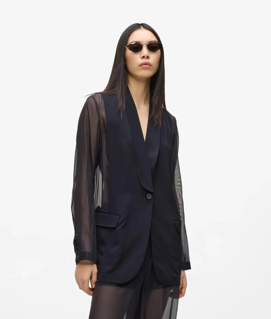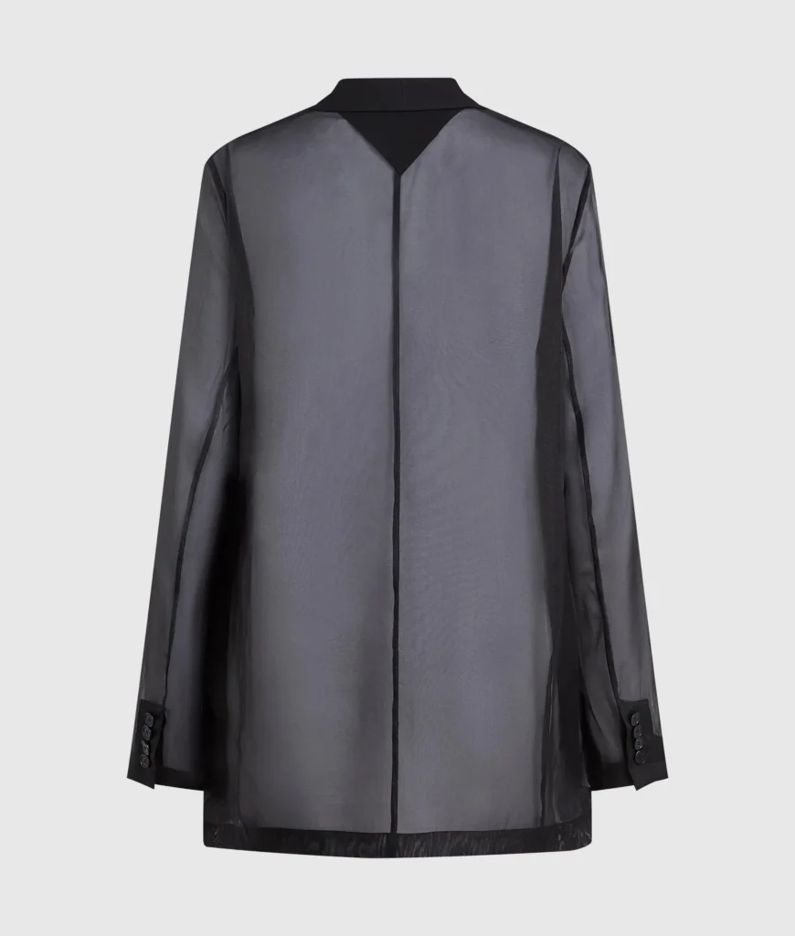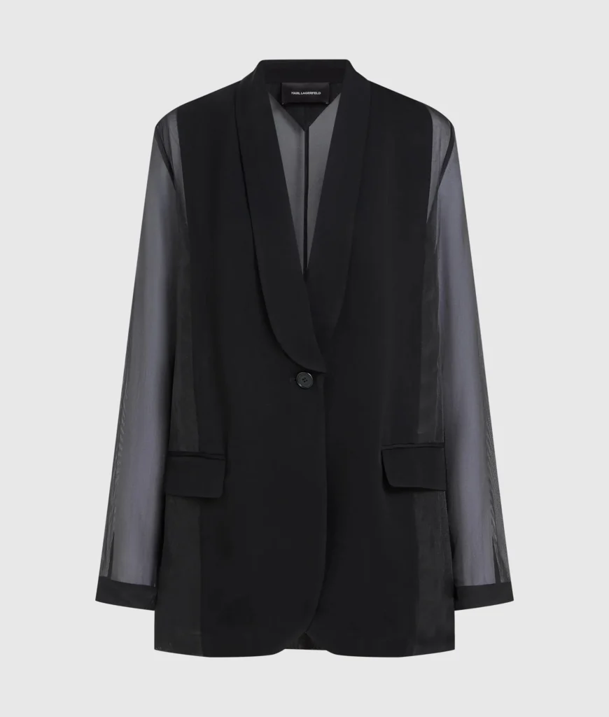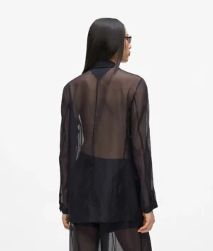 Vācu luksusa zīmola Karl Lagerfeld viegla un gaisīga pagarināta silueta sieviešu žakete melnā krāsā. Izgatavota no caurspīdīga viskozes maisījuma materiāla. Papildināta ar noapaļotiem atlokiem un necaurspīdīgu vestes daļu priekšpusē, kā arī smalku zīmola monogrammas vientoņa izšuvumu uz kabatas atloka.