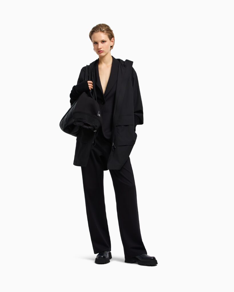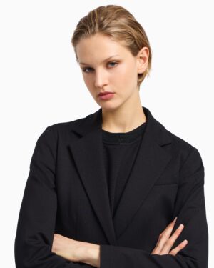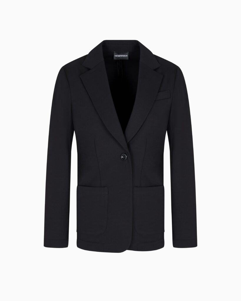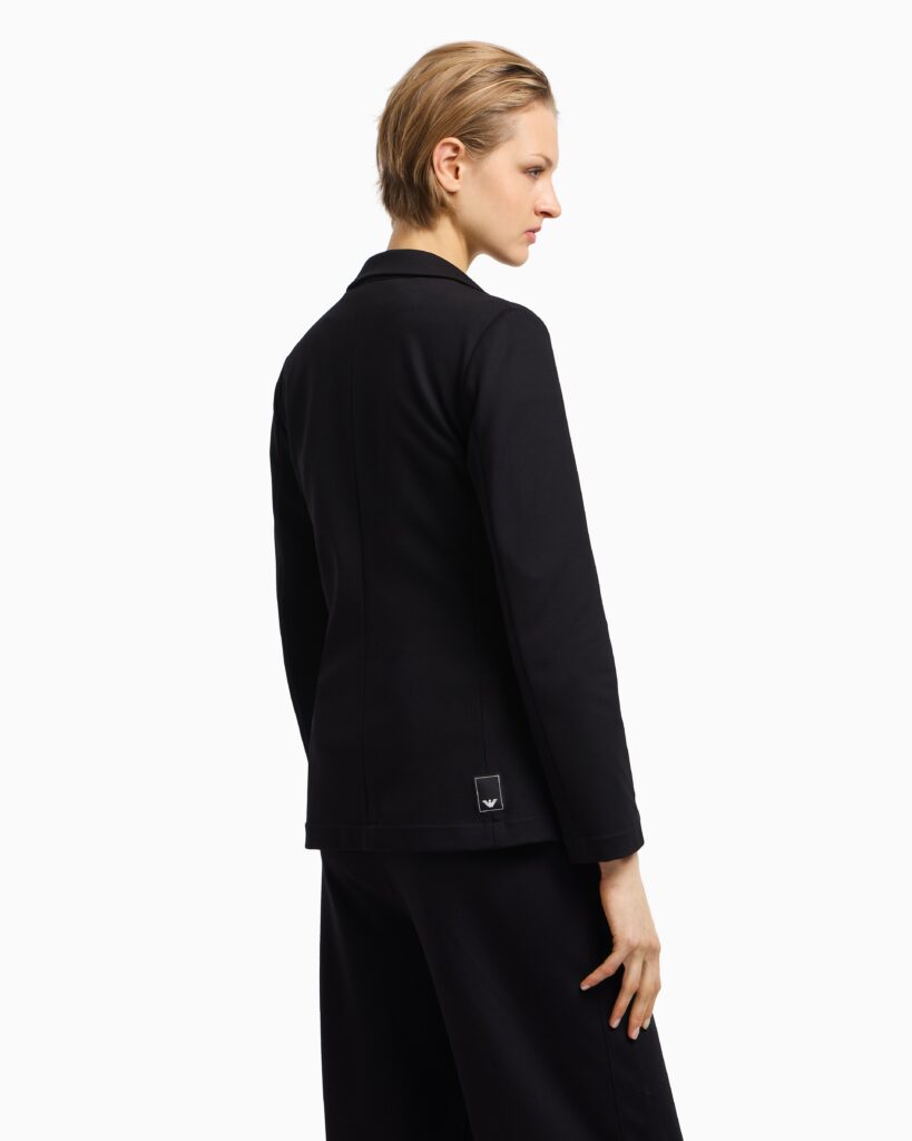 Itāļu luksusa zīmola Emporio Armani melna sieviešu žakete no Travel Essentials kapsulkolekcijas. Izgatavota no stingra, blīva un elastīga viskozes maisījuma džersija auduma. Papildināta ar uzšūtām sānu kabatām un kontrastējošu zīmola emblēmu mugurpusē.