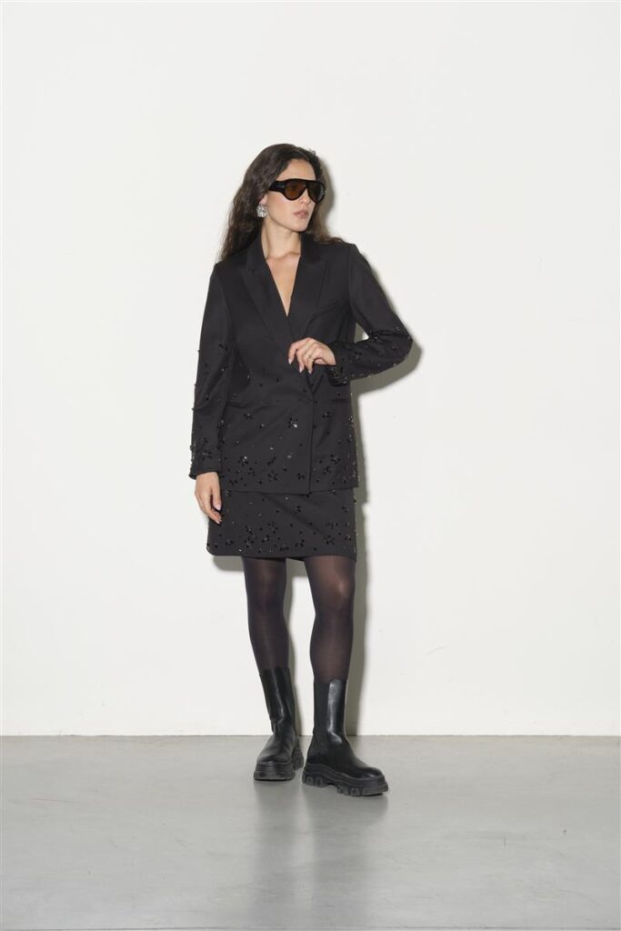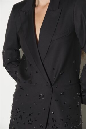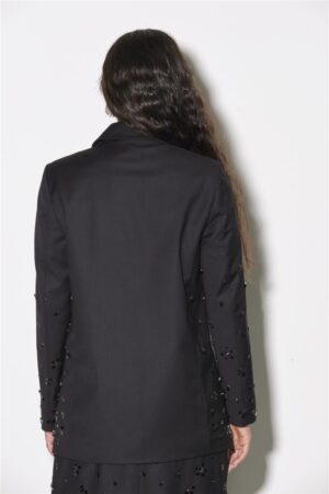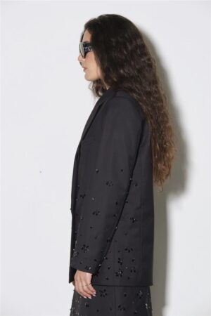 Itāļu modes zīmola KAOS eleganta un izsmalcināta sieviešu žakete melnā krāsā ar viegli mirdzošu dekoru un fliteru un izšuvumiem. Papildināta ar smailiem atlokiem un divrindu pogu aizdari.