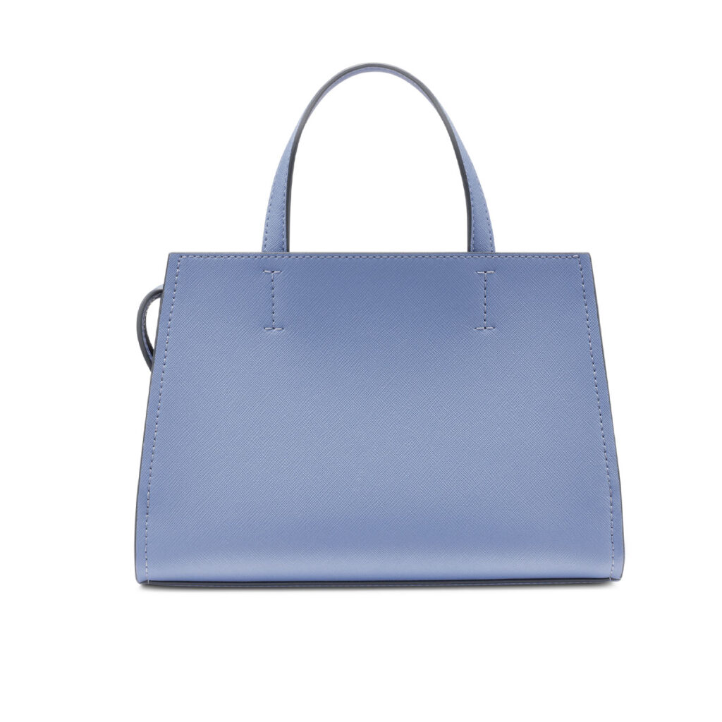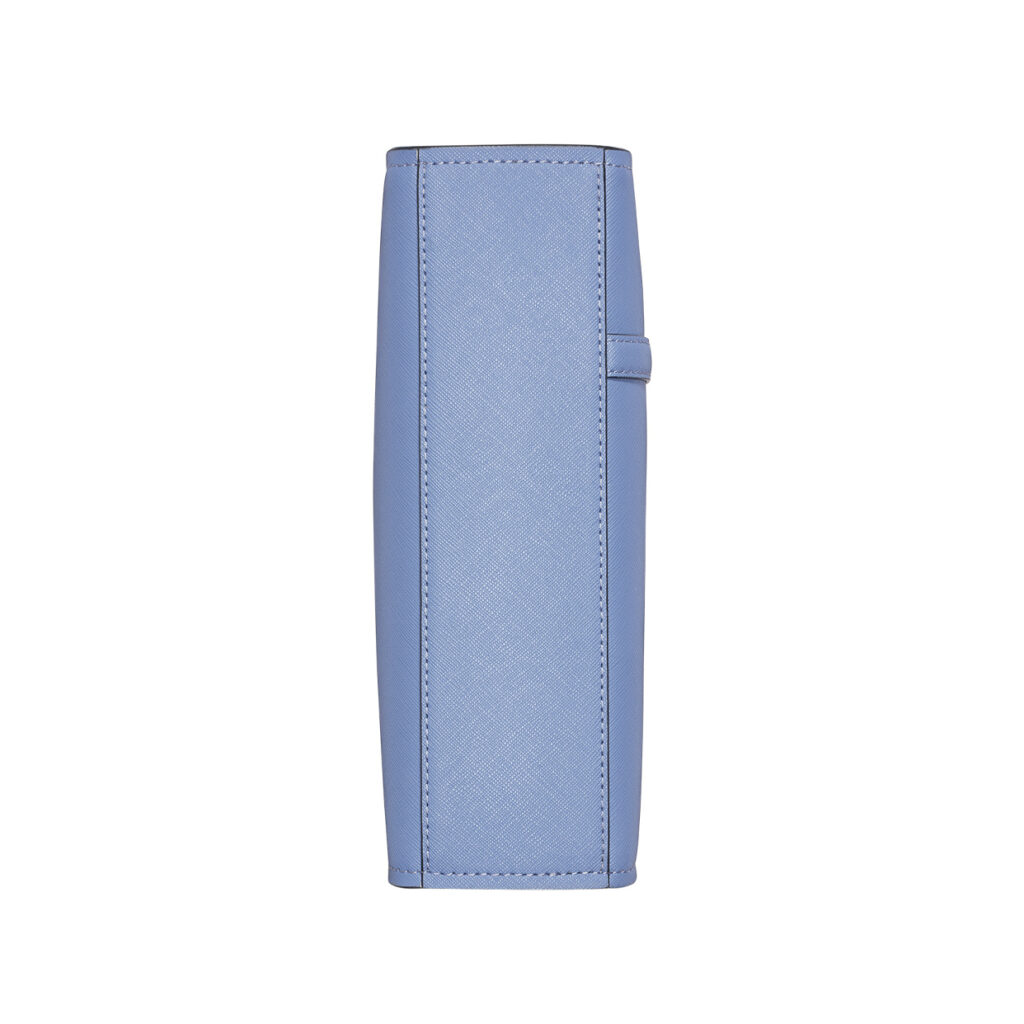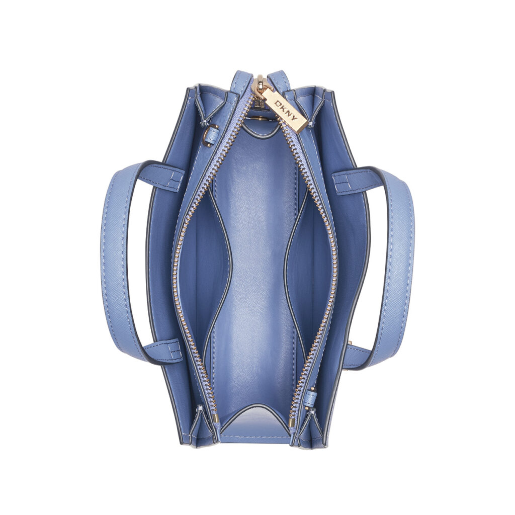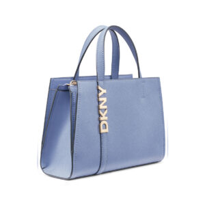 ASV modes zīmola DKNY neliela sieviešu rokassoma lavandas zilā krāsā. Izgatavota no stingra kompozītmateriāla ar dabīgās ādas pārklājumu un smalki rievotu struktūru. Papildināta ar diviem izturīgiem rokturiem un noņemamu plecu siksniņu. Akcentēta ar matētām zelta krāsas apdares un zīmola logotipa detaļām.