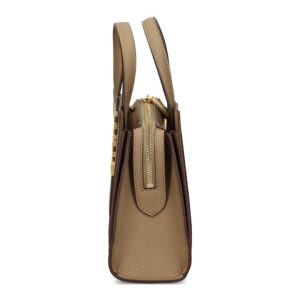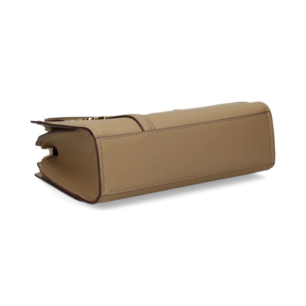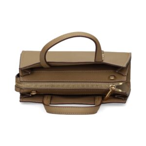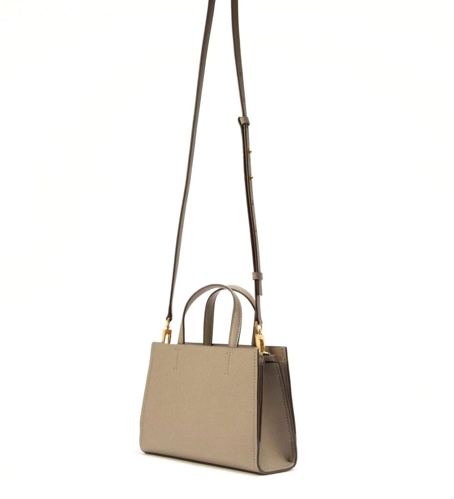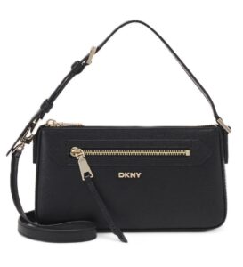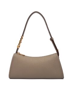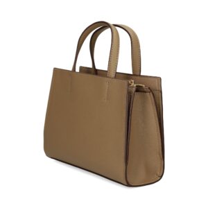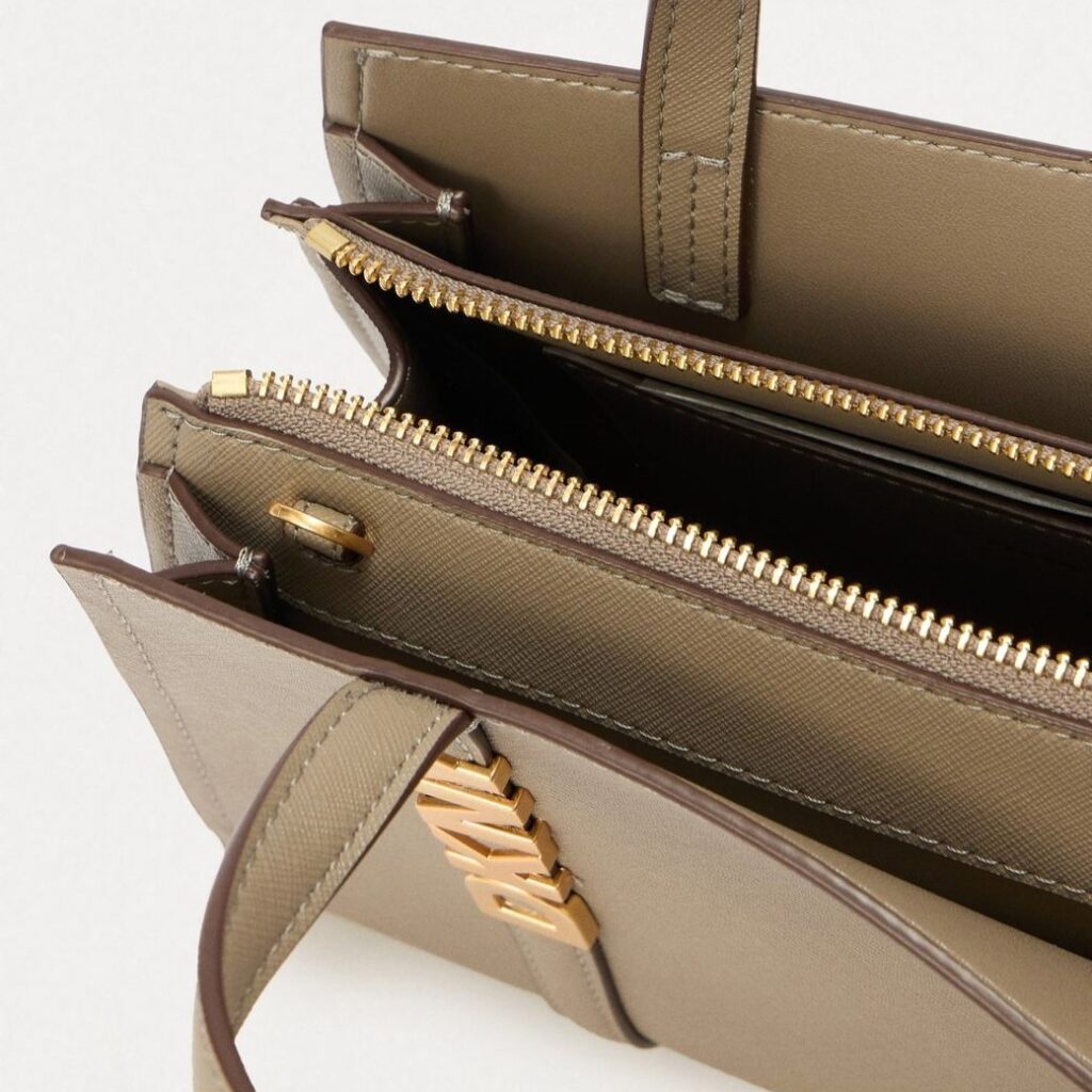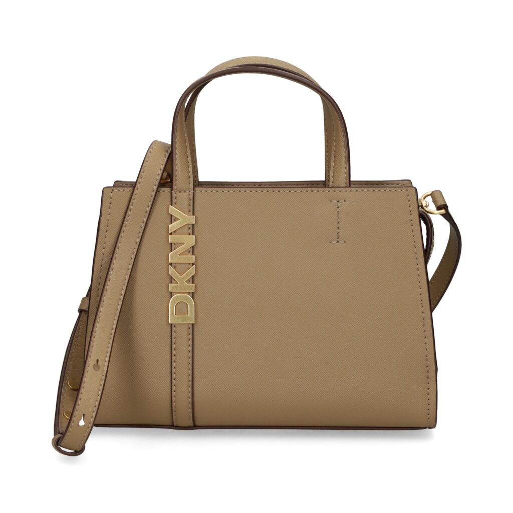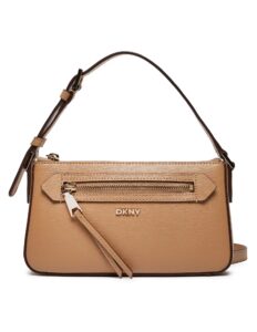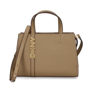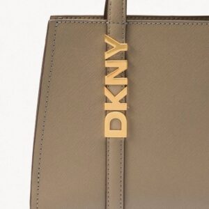 ASV modes zīmola DKNY neliela sieviešu rokassoma pelēcīgi brūnā krāsā. Izgatavota no stingra kompozītmateriāla ar dabīgās ādas pārklājumu un smalki rievotu struktūru. Papildināta ar diviem izturīgiem rokturiem un noņemamu plecu siksniņu. Akcentēta ar matētām zelta krāsas apdares un zīmola logotipa detaļām.