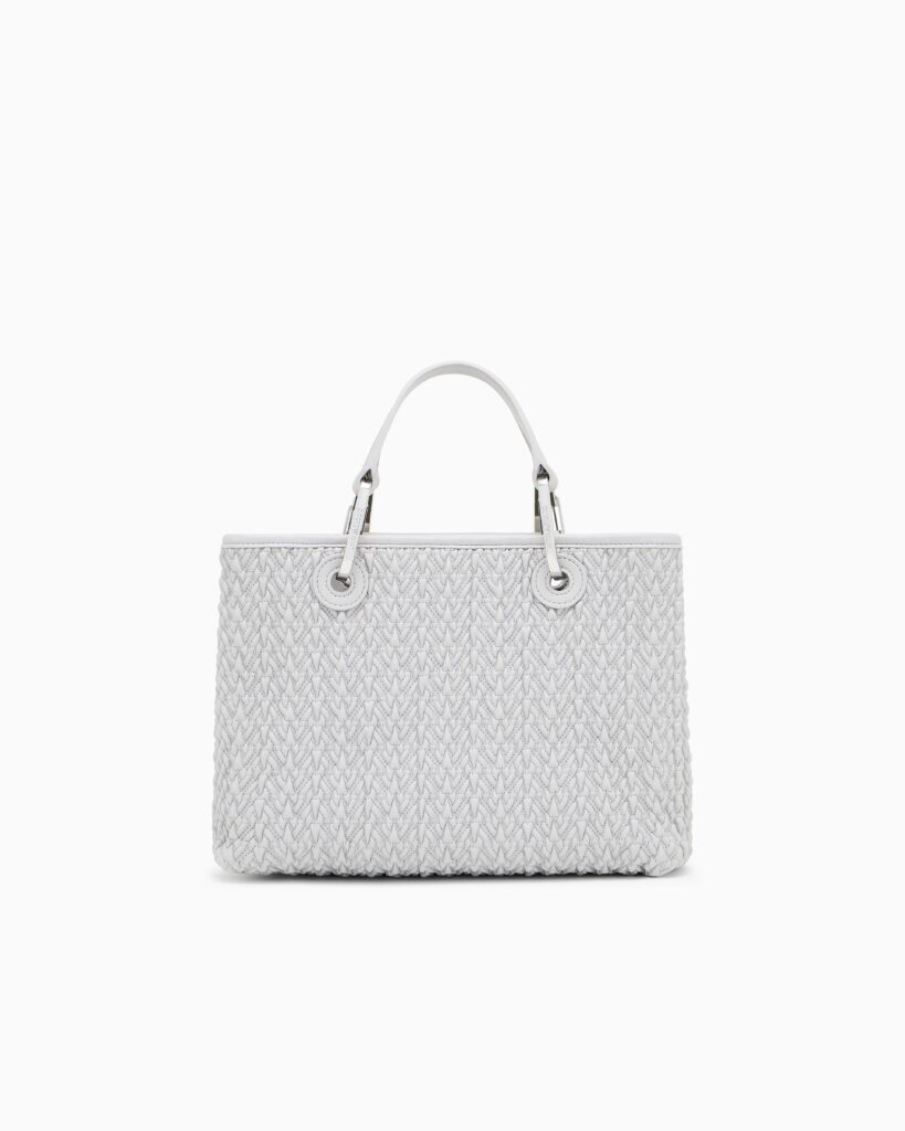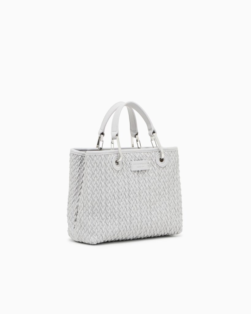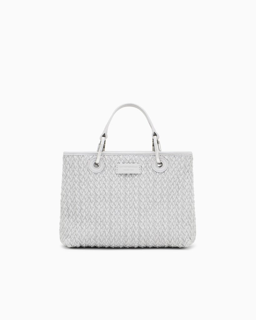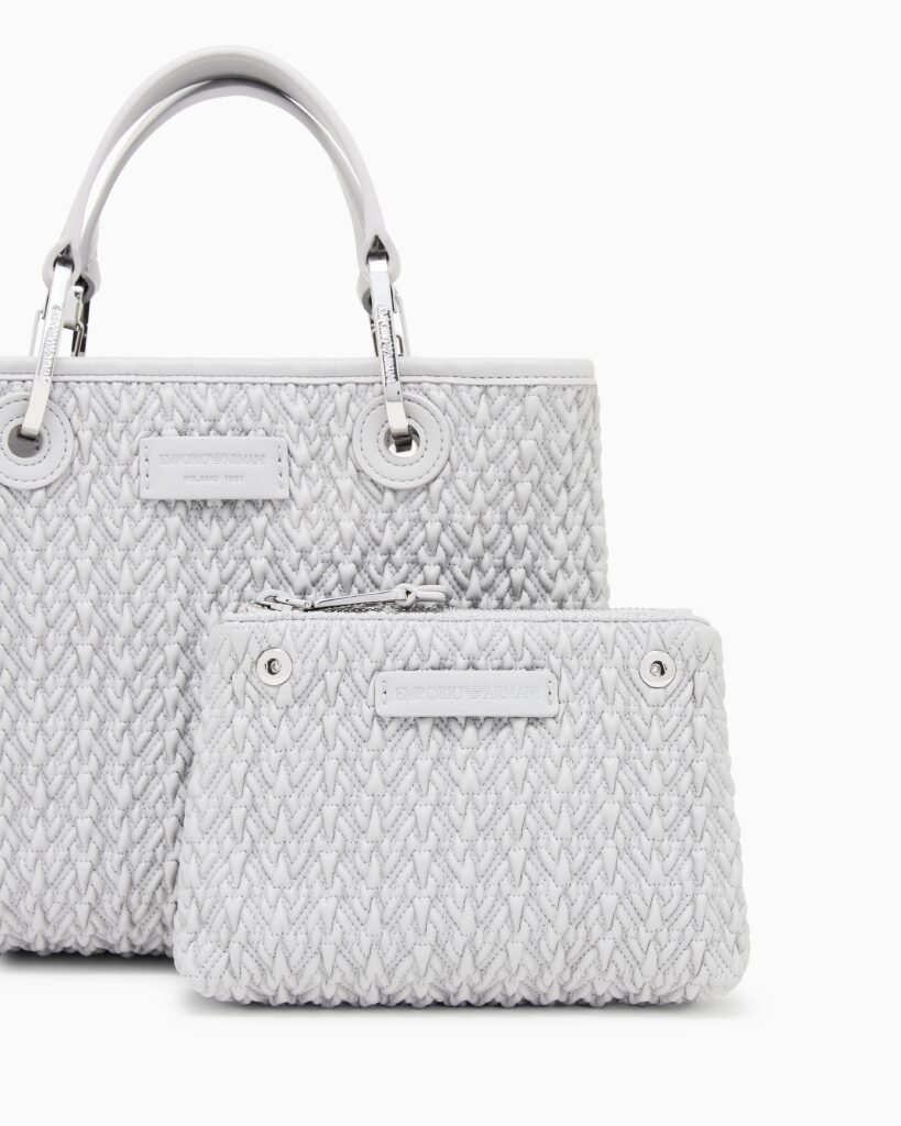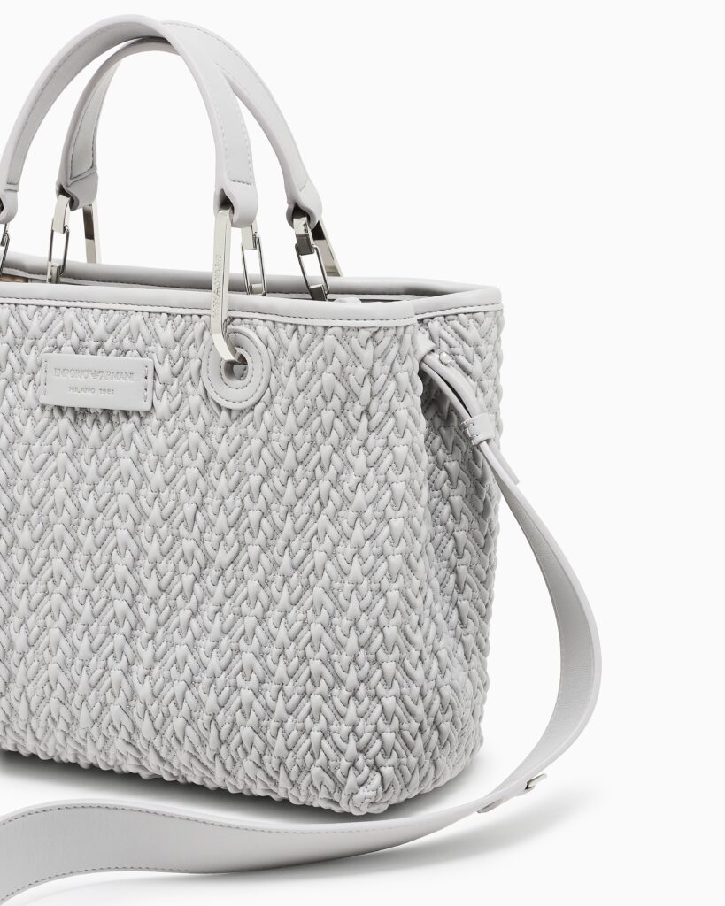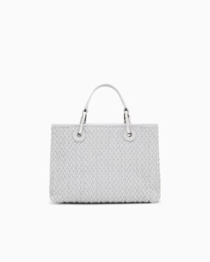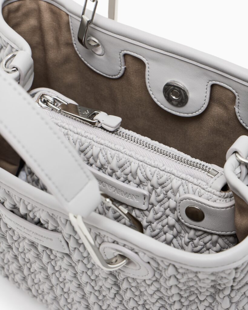 Itāļu luksusa zīmola Emporio Armani neliela ikdienas soma ar dekoratīvu struktūru gaiši pelēkā krāsā. Izgatavota no mīksta ādas imitācijas materiāla. Papildināta ar magnētisko aizdari, noņemamu plecu siksnu un izņemamu iekšējo maciņu, kā arī dažādām zīmola logotipa detaļām.