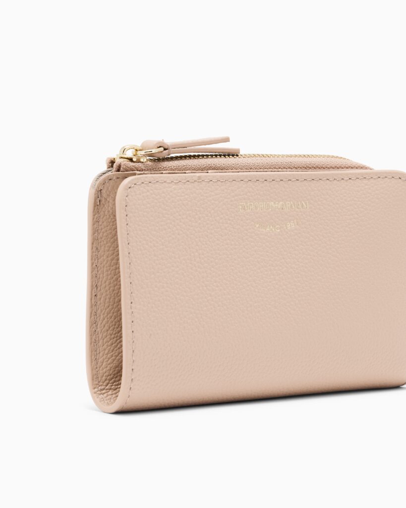 Itāļu luksusa zīmola Emporio Armani klasisks sieviešu naudas maks krēmīgi bēšā krāsā. Izgatavots no raupjas dabīgās ādas. Papildināts ar banknošu, karšu un monētu nodalījumiem. Akcentēts arī zelta krāsas metāla un zīmola logotipa detaļām.