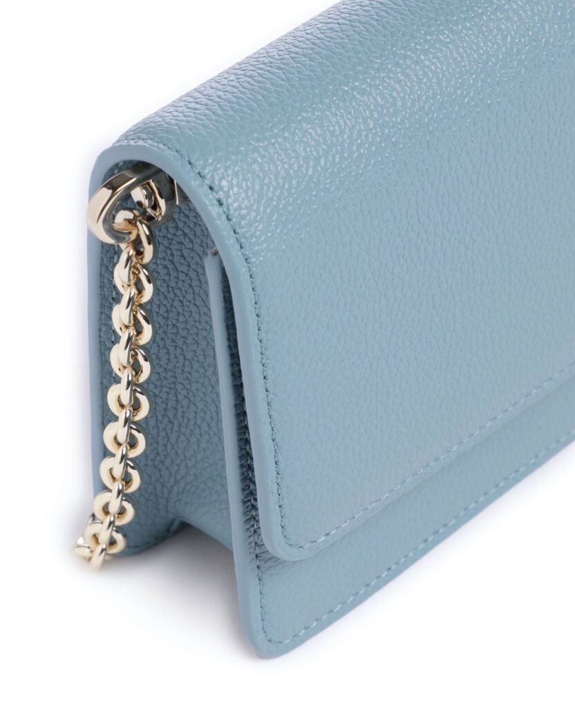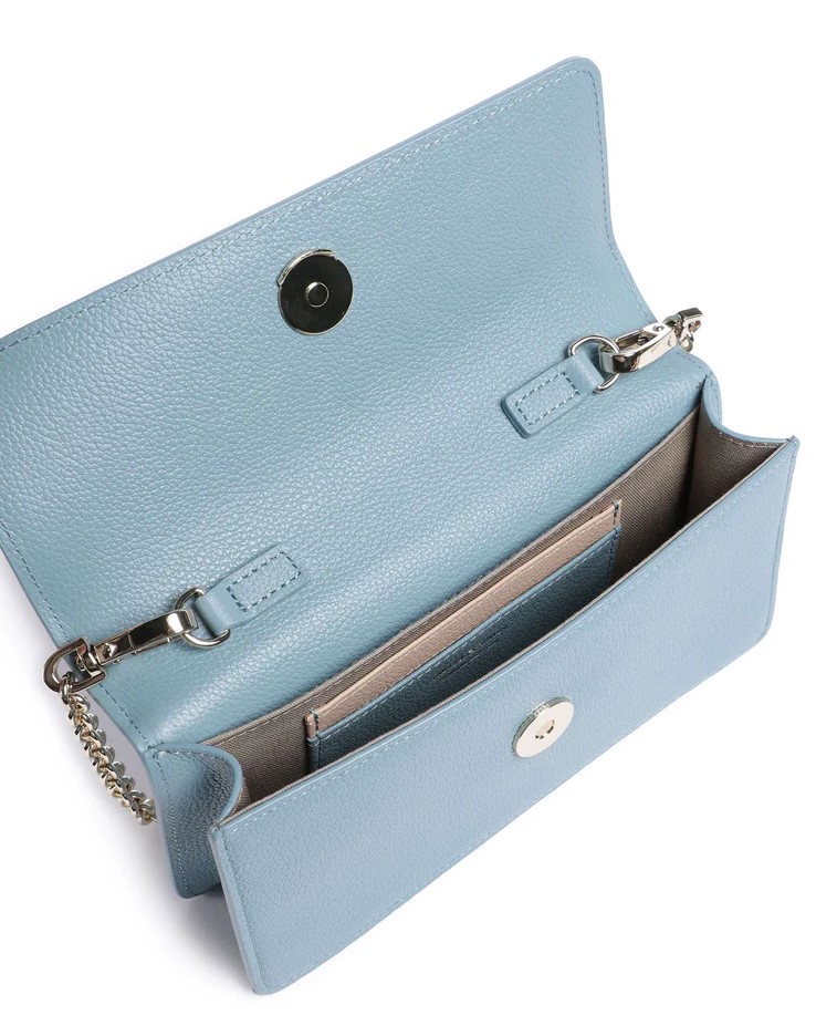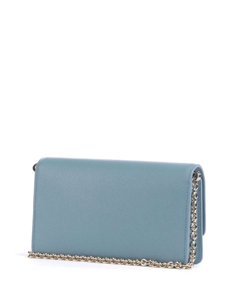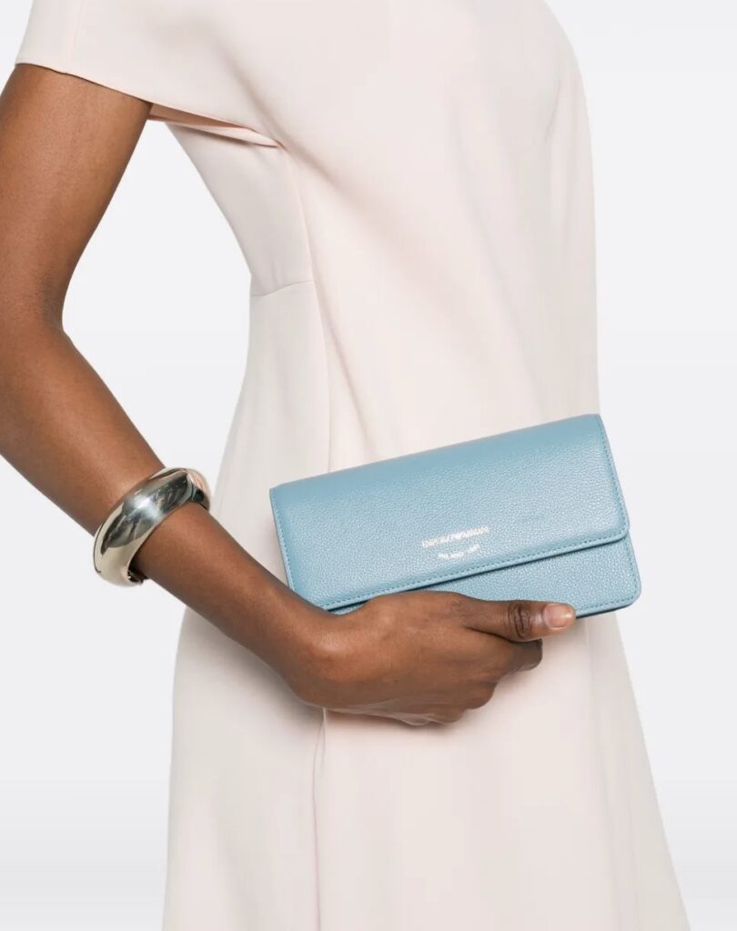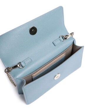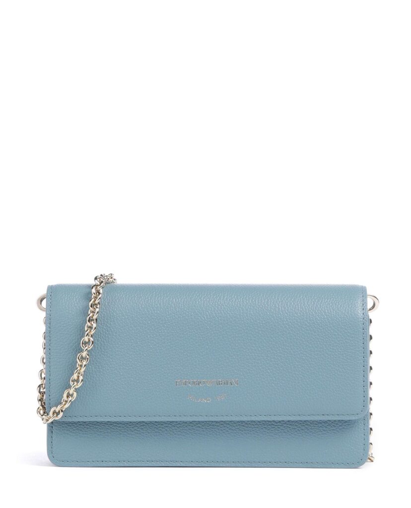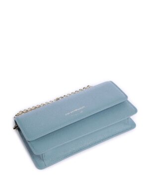 Itāļu luksusa zīmola Emporio Armani debeszila sieviešu rokassomiņa ar noņemamu zelta krāsas plecu ķēdīti un zīmola logotipa akcentu. Izgatavota no 100% dabīgās ādas. Papildināta ar iekšējiem karšu nodalījumiem un magnētisku aizdari.
