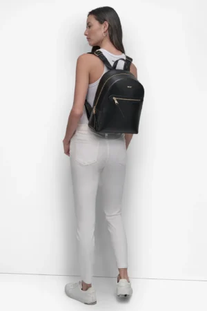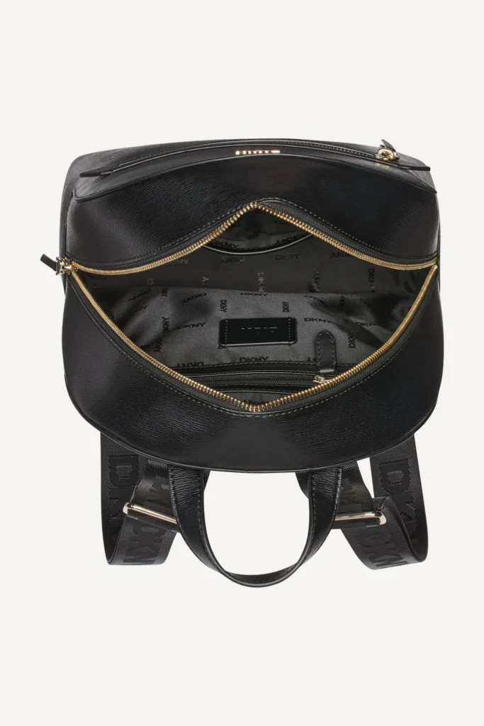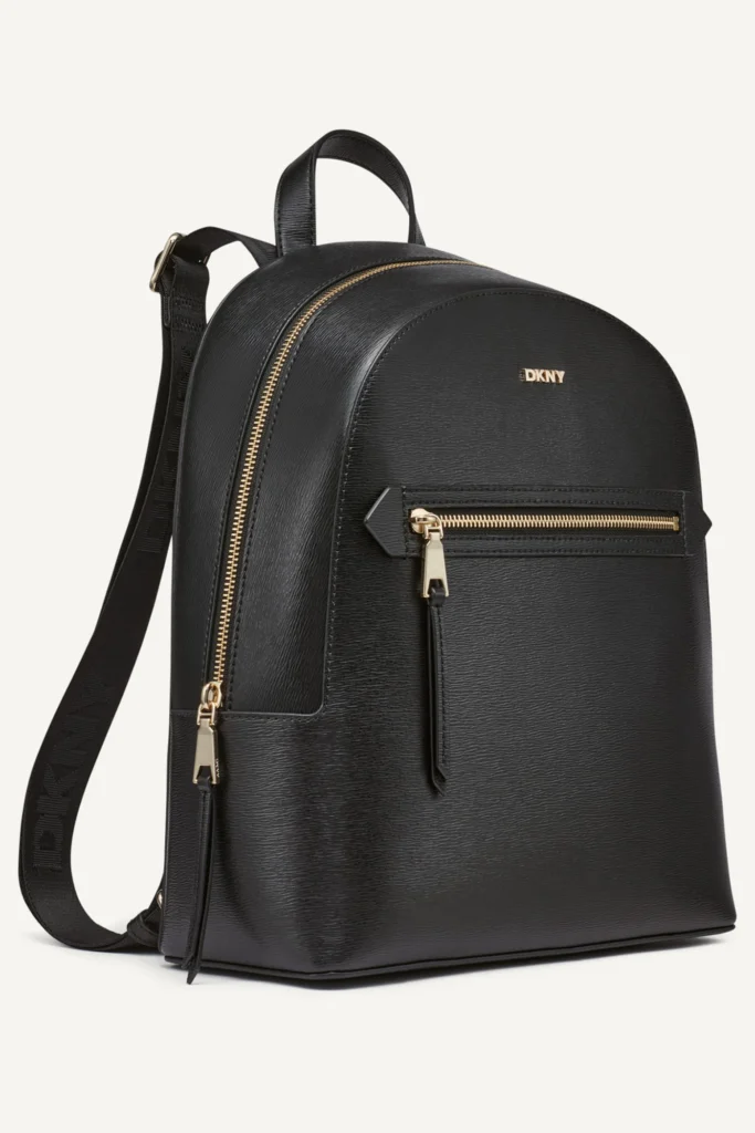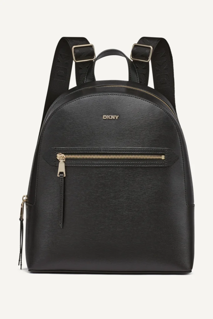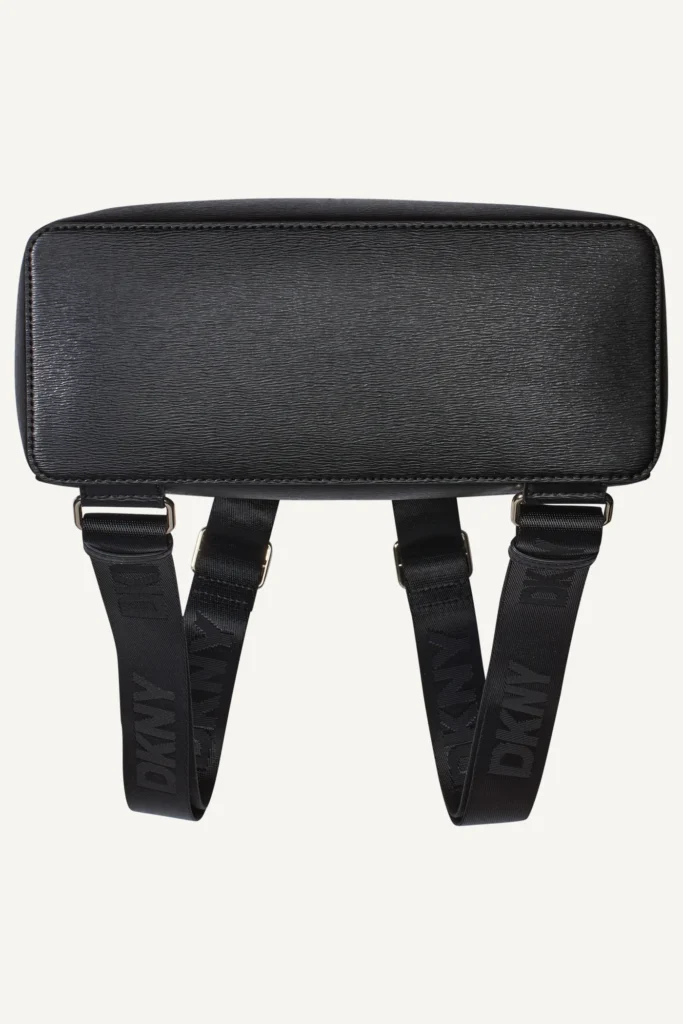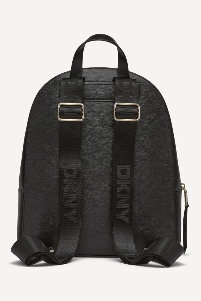 ASV modes zīmola DKNY stilīga sieviešu mugursoma melnā krāsā. Izgatavota no stingra dabīgās ādas materiāla ar smalki rievotu struktūru. Papildināta ar regulējamām zīmola dizaina plecu lencēm un kabatām. Akcentēta ar zelta krāsas metāla un zīmola logotipa detaļām.