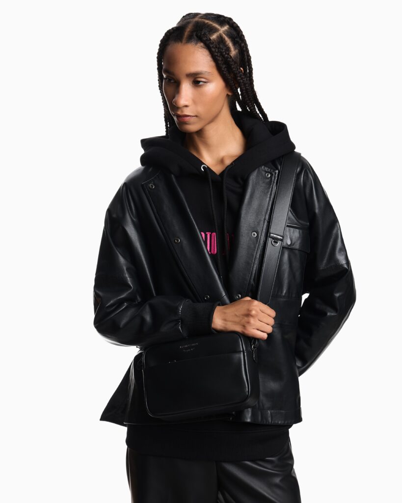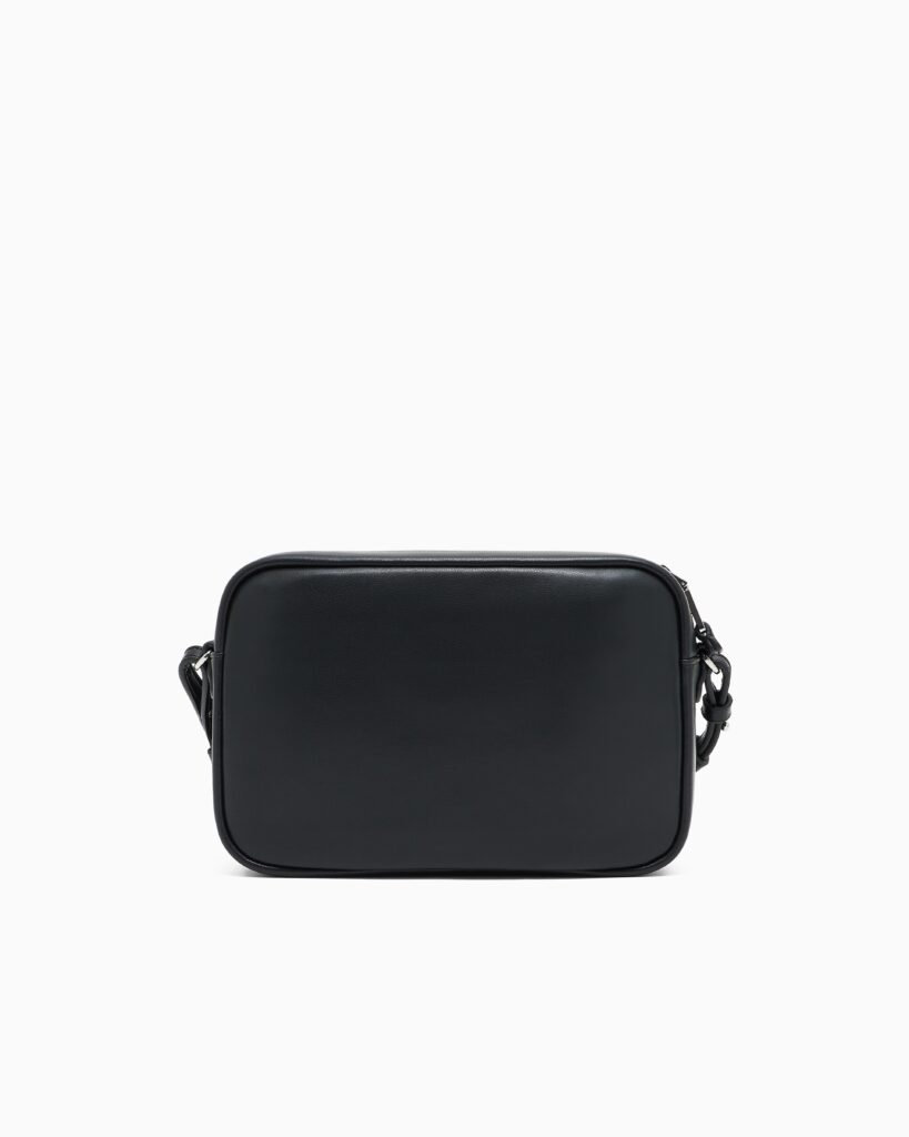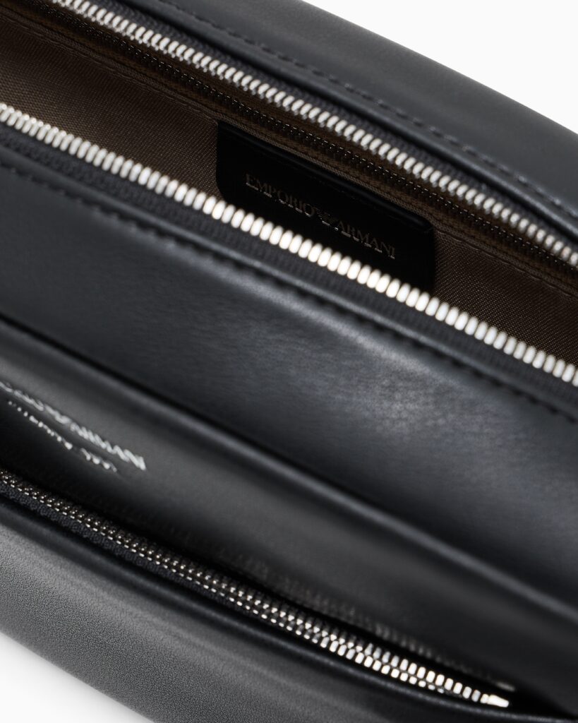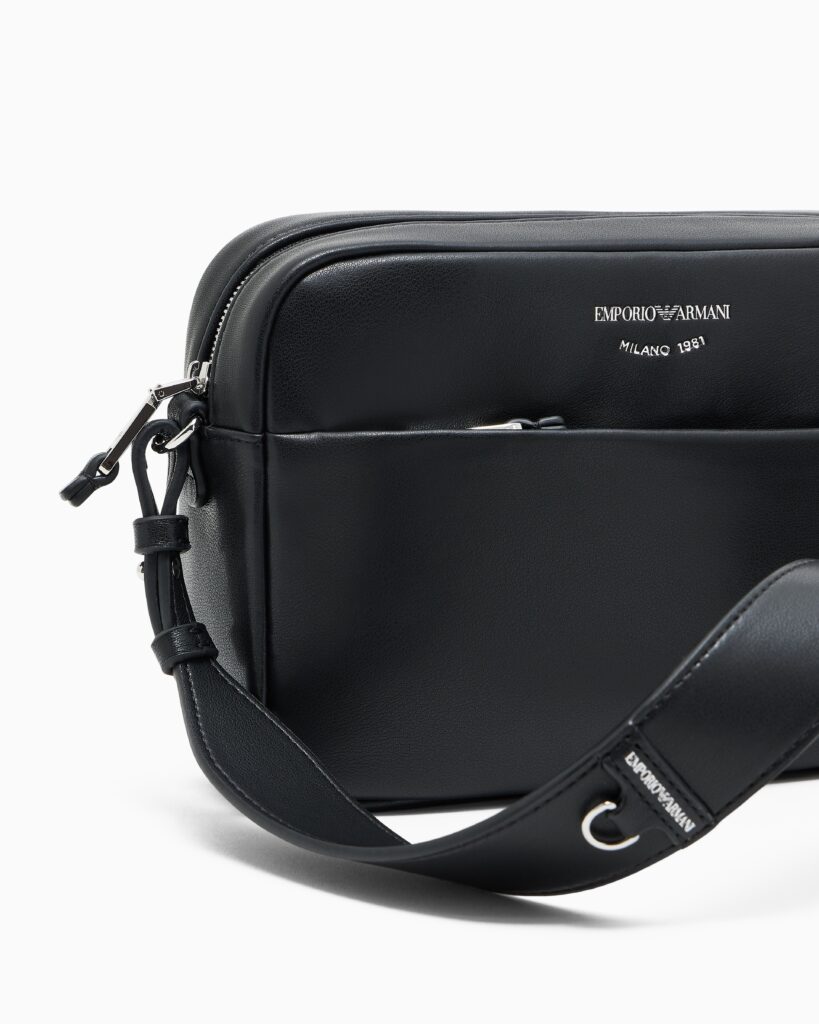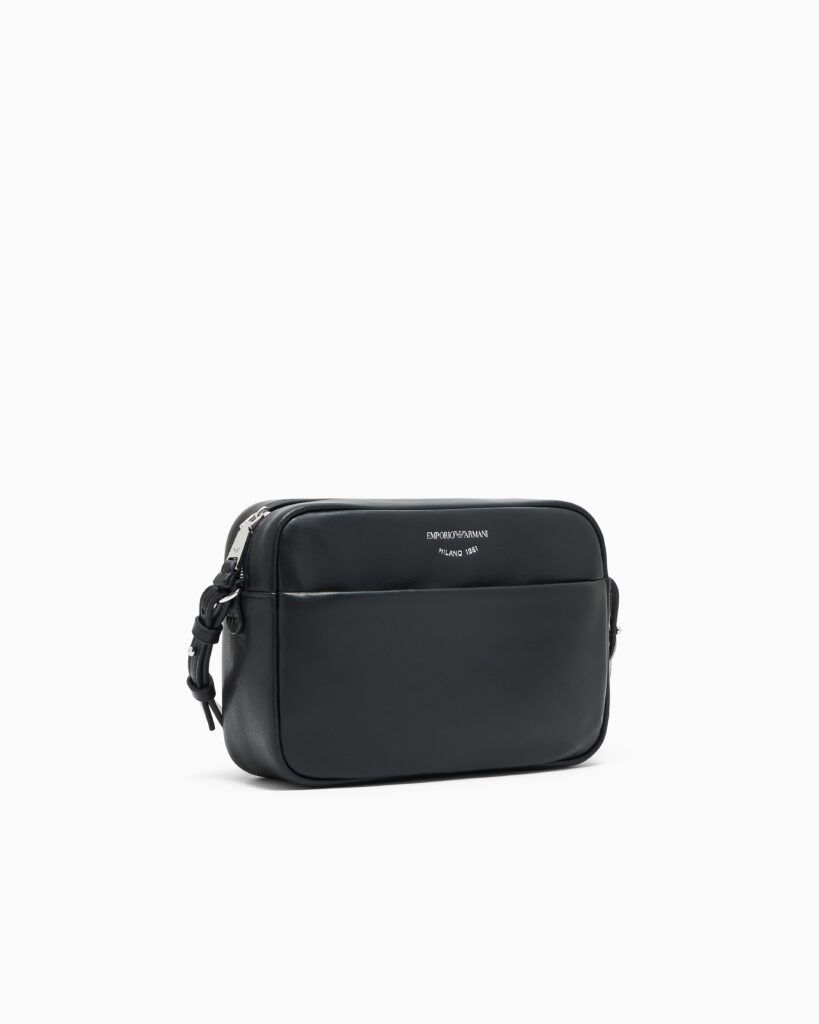 Itāļu luksusa zīmola Emporio Armani taisnstūrveida plecu un peronīgo piederumu somiņa melnā krāsā. Izgatavota no gludas un mīkstas dabīgās ādas. Papildināta ar ārējo nodalījumu un noņemamu plecu siksnu, kā arī sudraba krāsas metāla un zīmola logotipa detaļām.