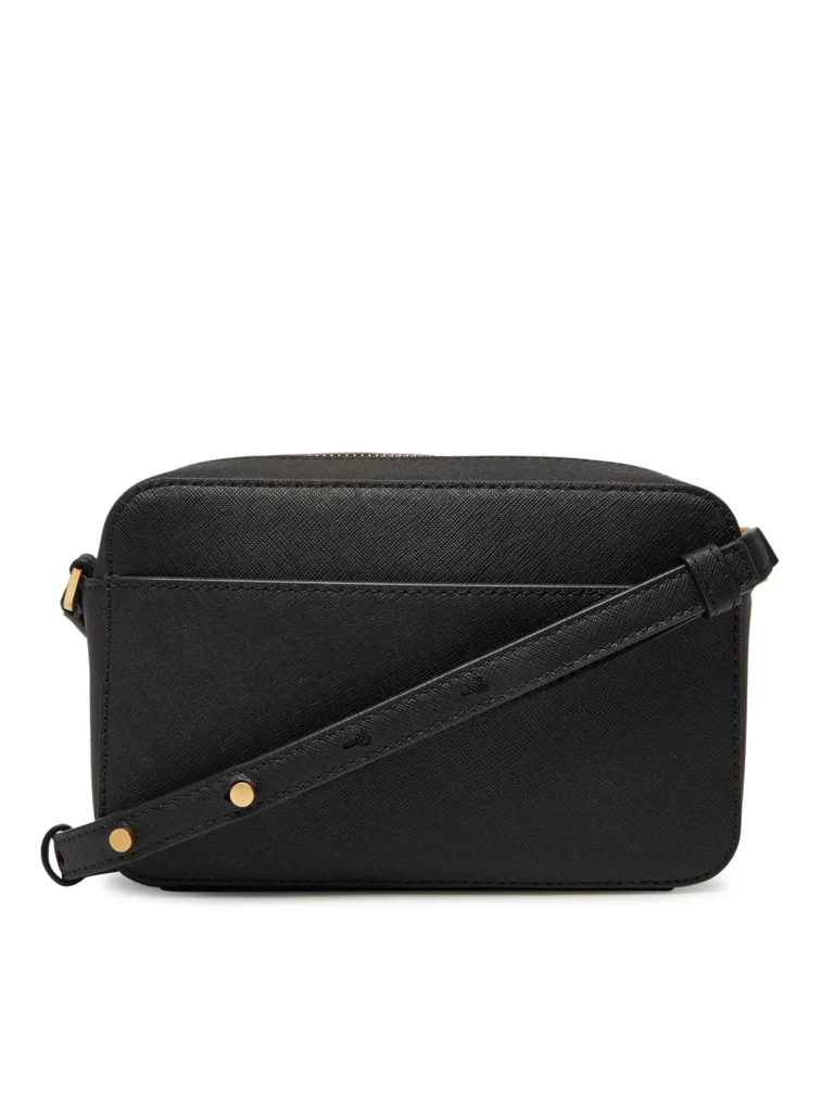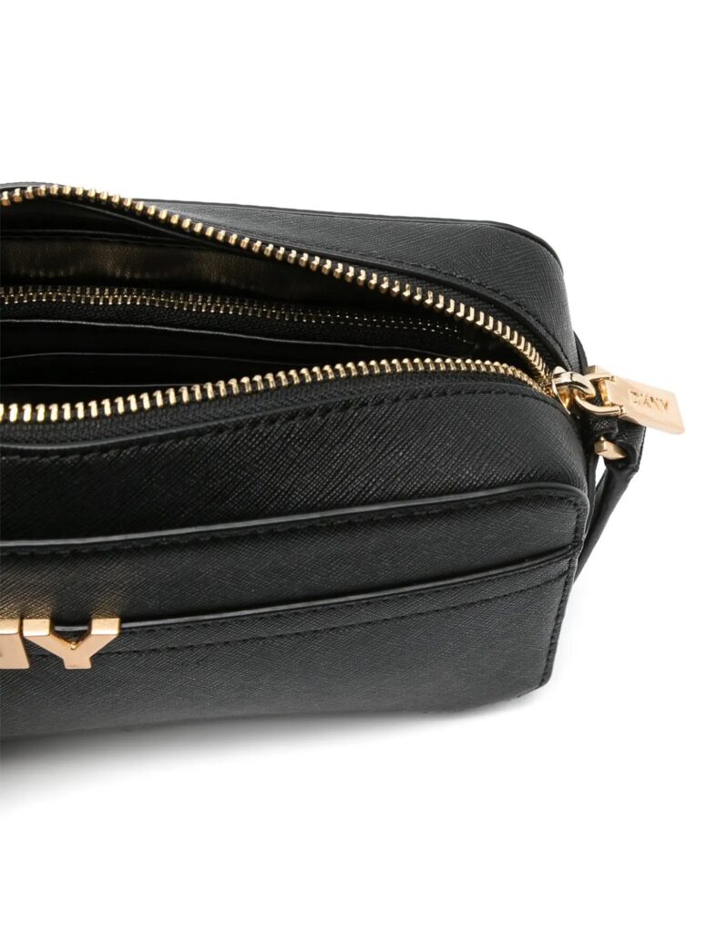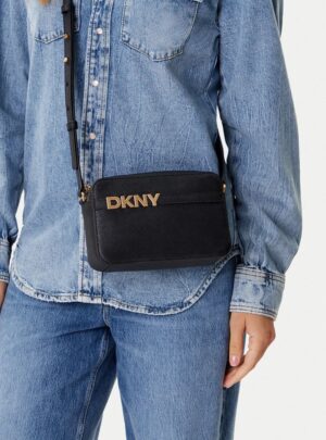 ASV modes zīmola DKNY kompakta taisnstūrveida plecu somiņa melnā krāsā. Izgatavota no stingra dabīgās ādas materiāla ar smalki rievotu struktūru. Papildināta ar regulējamu plecu siksnu, kā arī zelta krāsas apdares un zīmola logotipa detaļām.