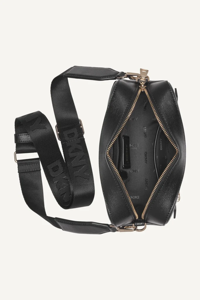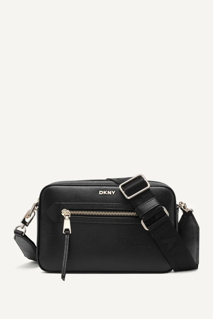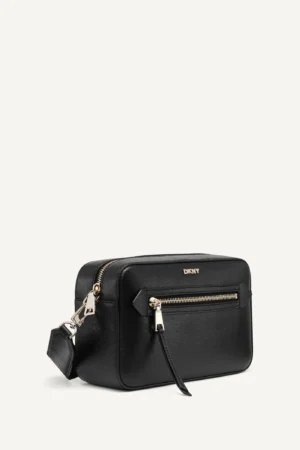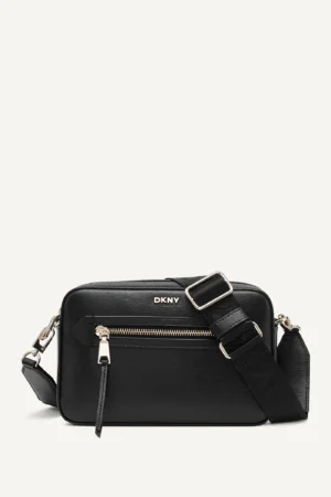 ASV modes zīmola DKNY taisnstūrveida plecu somiņa melnā krāsā. Izgatavota no stingra materiāla ar dabīgās ādas pārklājumu un smalki rievotu struktūru. Papildināta ar vairākiem nodalījumiem un noņemamu zīmola dizaina plecu siksnu, kā arī zelta krāsas apdares un logo detaļām.
