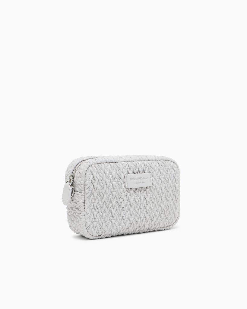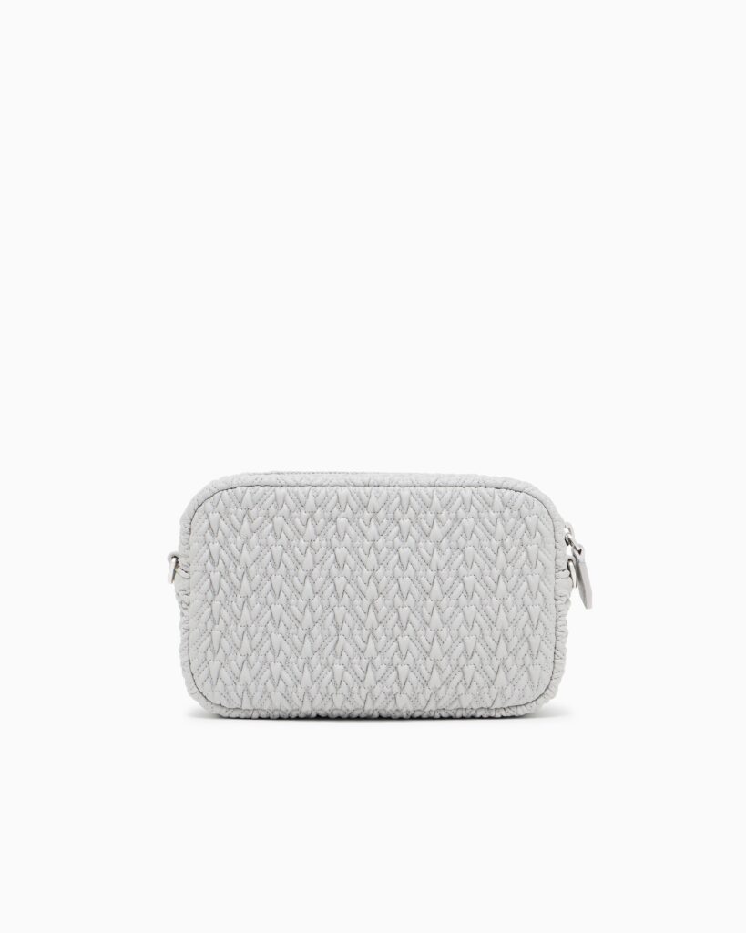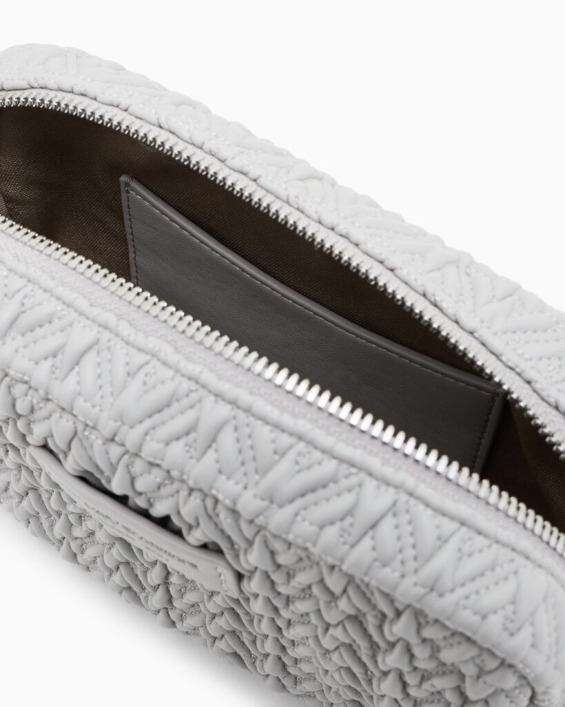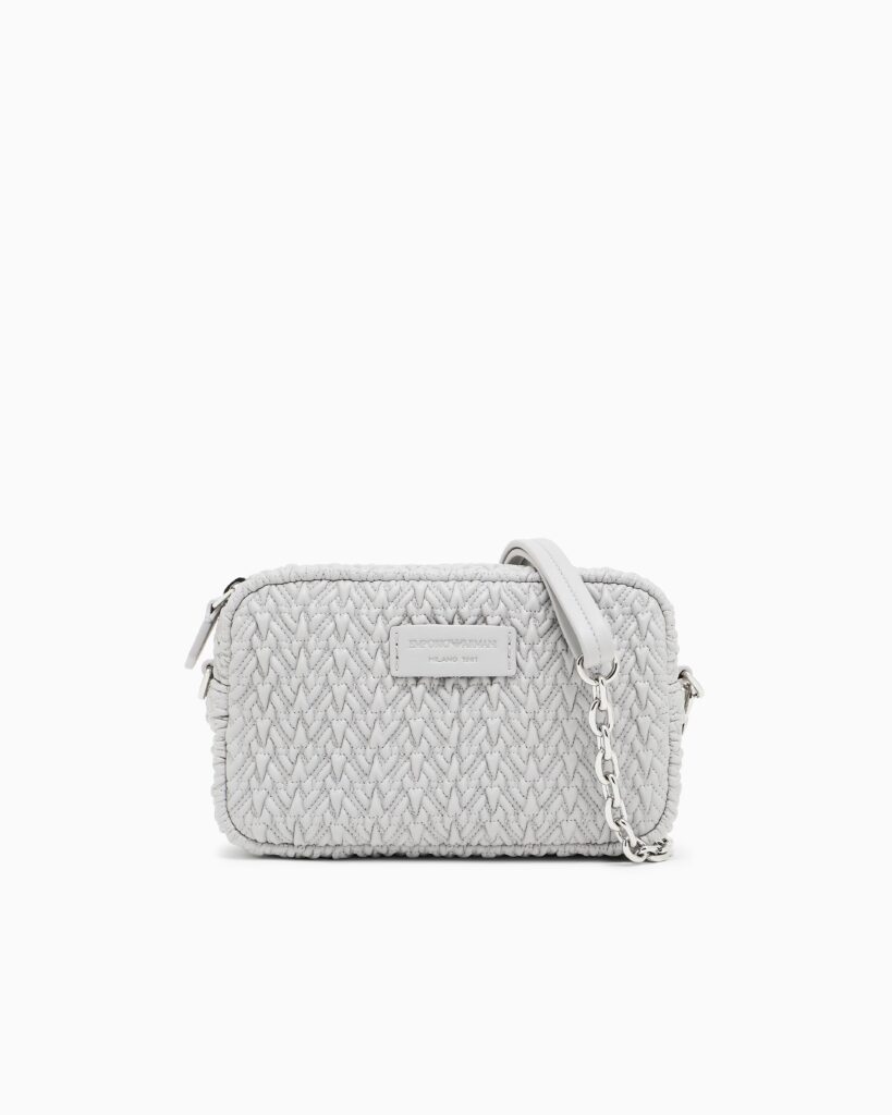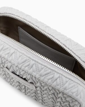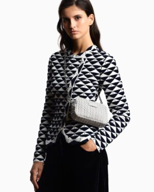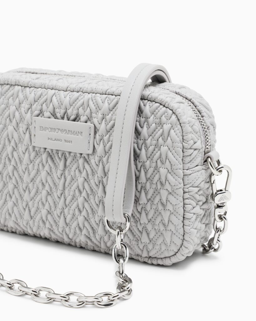 Itāļu luksusa zīmola Emporio Armani maza plecu somiņa ar dekoratīvu struktūru gaiši pelēkā krāsā. Izgatavota no mīksta ādas imitācijas materiāla. Papildināta ar rāvējslēdzēja aizdari, noņemamu ķēdes siksniņu un dažādām zīmola logotipa detaļām.