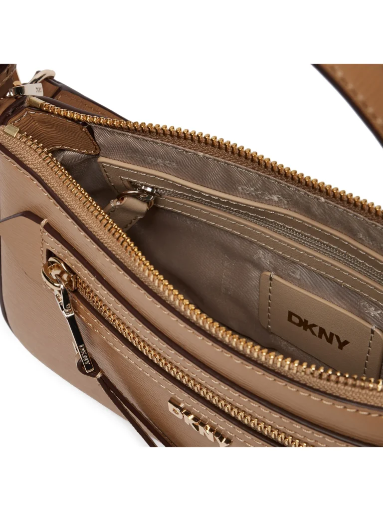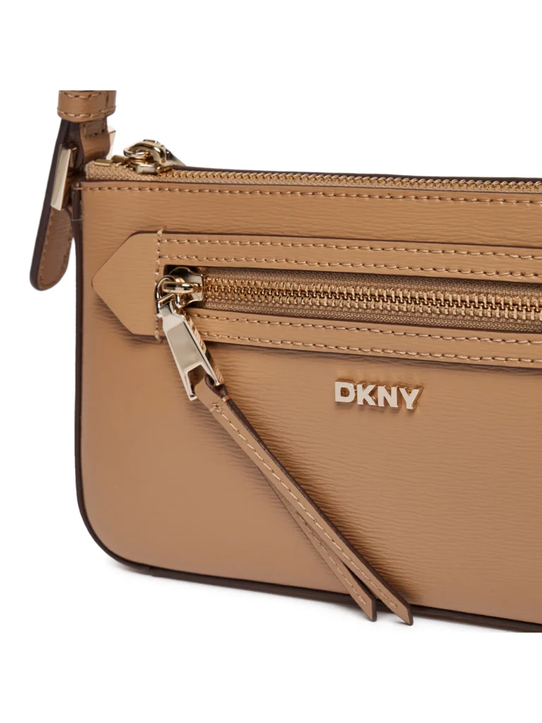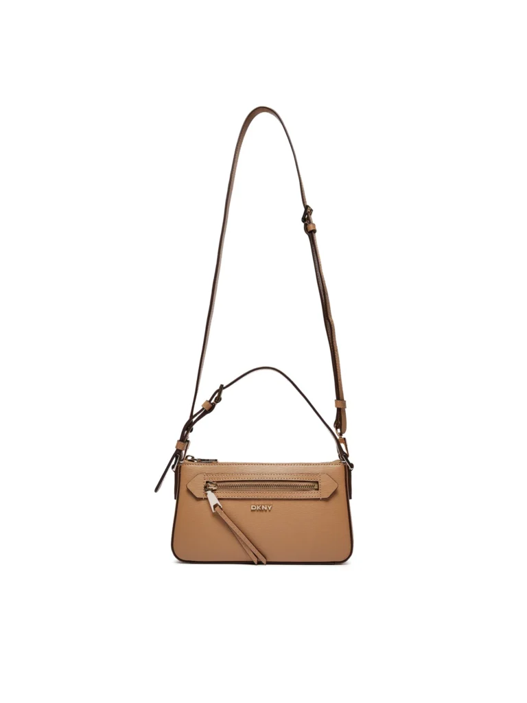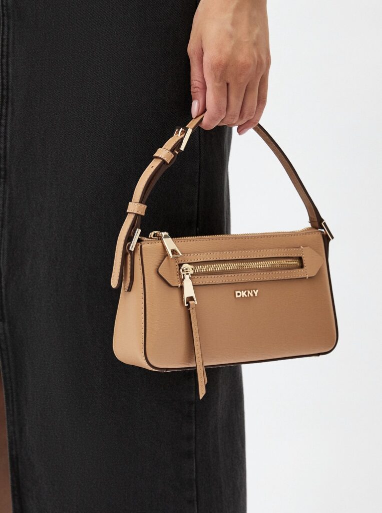 ASV modes zīmola DKNY maza sieviešu rokassomiņa ar regulējamu rokturi smilšu brūnā krāsā. Izgatavota no stingras augstākās kvalitātes dabīgās ādas ar smalki rievotu struktūru. Papildināta ar noņemamu plecu siksniņu, kā arī zelta krāsas metāla un zīmola logotipa detaļām.