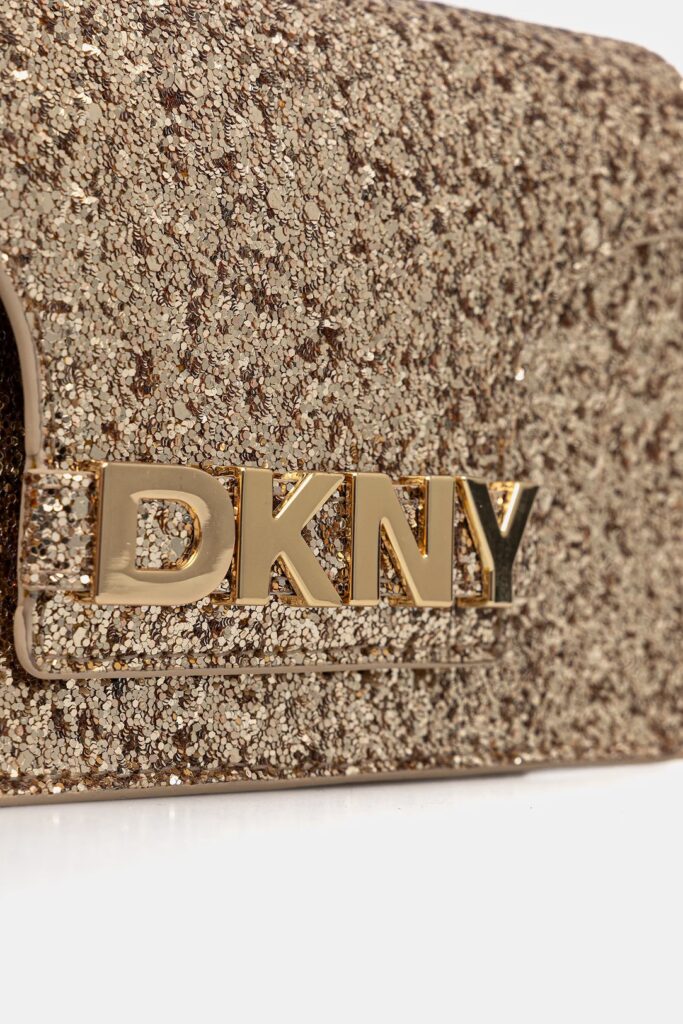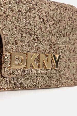 ASV modes zīmola DKNY grezna sieviešu plecu somiņa ar pārliekamu magnētisko aizdari un noņemamu plecu siksnu. Izgatavota no stingra sintētiskā materiāla ar zeltaini mirdzošu raupjas tekstūras pārklājumu un glancētu iekšpusi. Papildināta ar iekšējiem nodalījumiem un zīmola logotipa akcentiem.