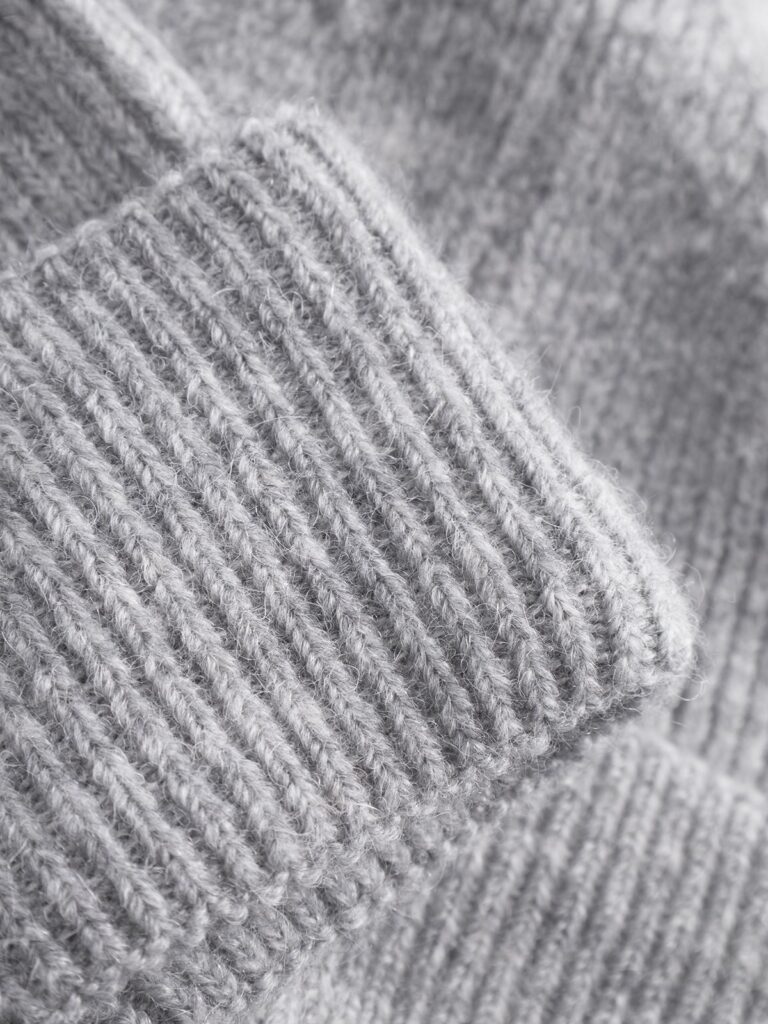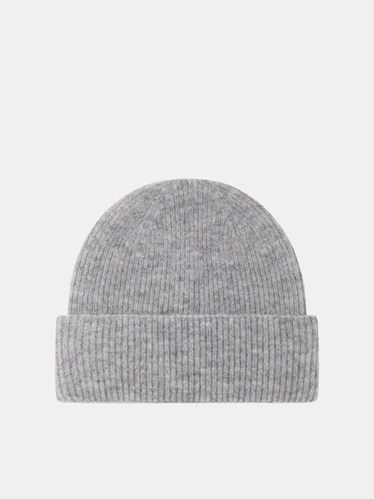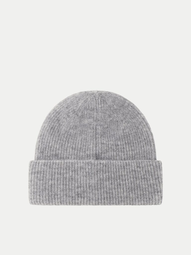 Šveices modes zīmola Strellson pelēka vīriešu cepure ar atloku. Izgatavota no alpakas un vilnas maisījuma dzijas rievota adījuma rakstā.