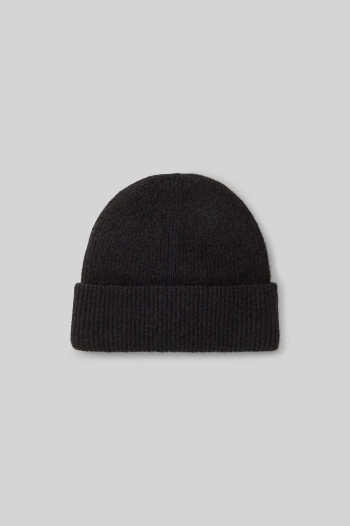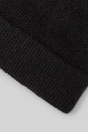 Šveices modes zīmola Strellson melna vīriešu cepure ar atloku. Izgatavota no biezas alpakas un vilnas maisījuma dzijas rievota adījuma rakstā.