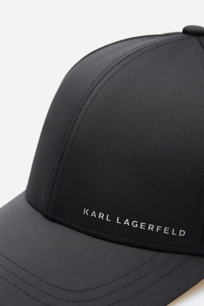 Vācu luksusa zīmola Karl Lagerfeld vīriešu beisbola stila cepure melnā krāsā ar sudrabaini pelēku zīmola logotipa akcentu sānā. Izgatavota no blīva un elastīga poliestera materiāla. Papildināta ar regulējamu aizdari mugurpusē.